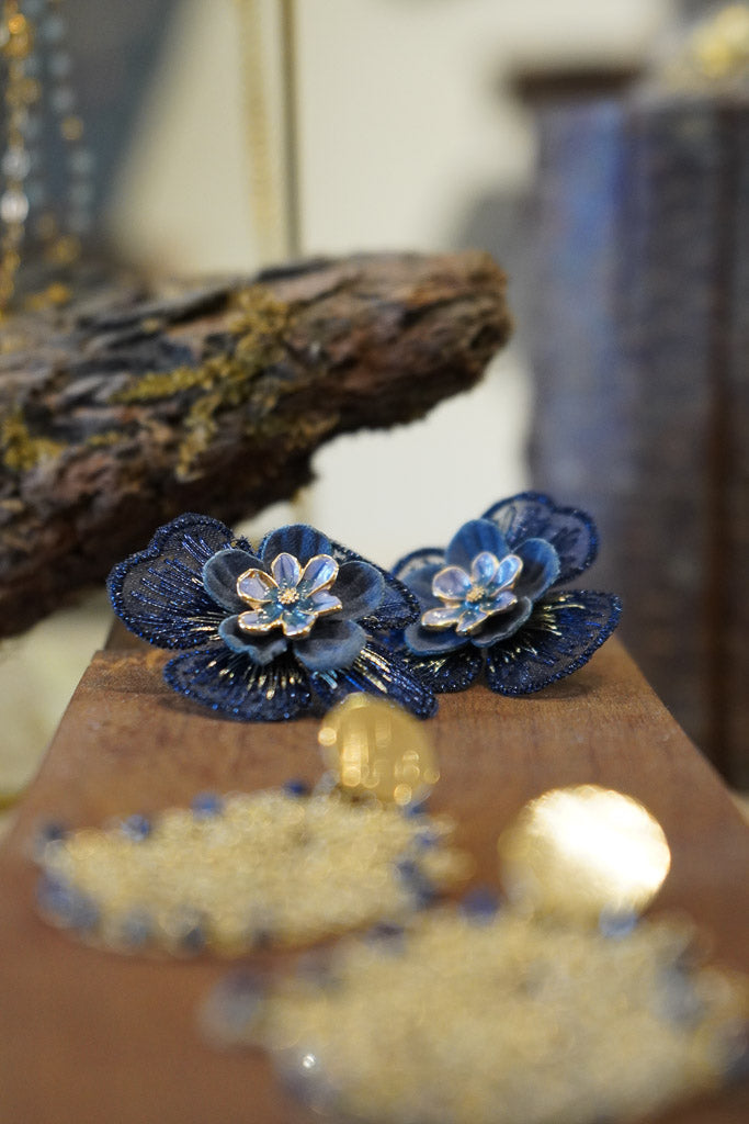 Estos aros en forma de flor están confeccionados a partir de una delicada tela con sutiles tonos azules y morados. Son el detalle perfecto para darle un toque especial a tu outfit sin dejar de ser fiel a tu estilo.