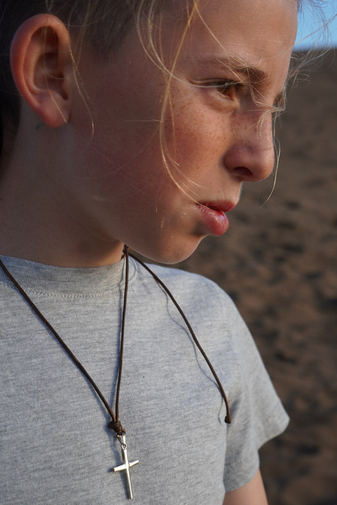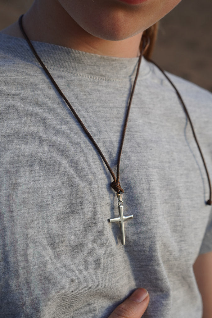 La cruz plata niño está hecha con plata 925 de alta calidad, con un cordel ajustable en imitación de cuero para mayor durabilidad. Disponible en dos tamaños, grande 3x2 cm y mediana 1,5x2cm. Ofrece resistencia y un diseño moderno para los más jóvenes.