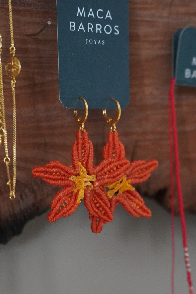 Estos aros de macramé en forma de flor son el complemento perfecto para cualquier ocasión. Hechos a mano con detalles delicados en tonos cálidos.