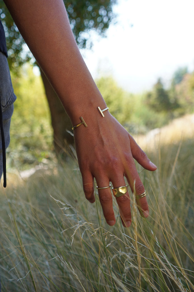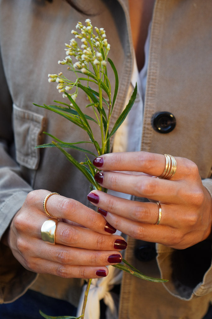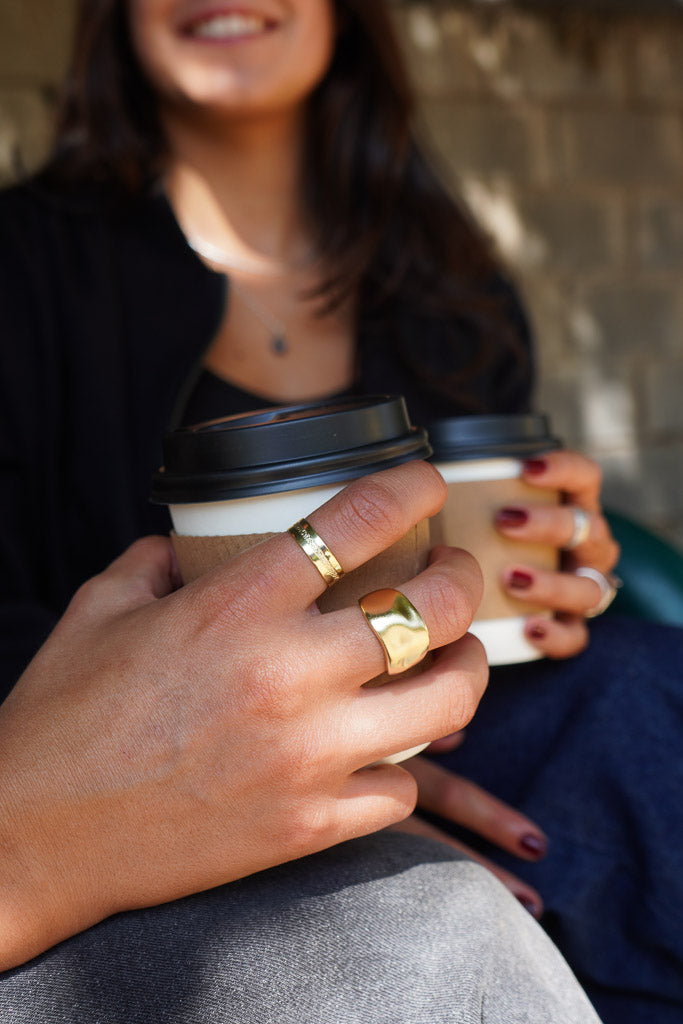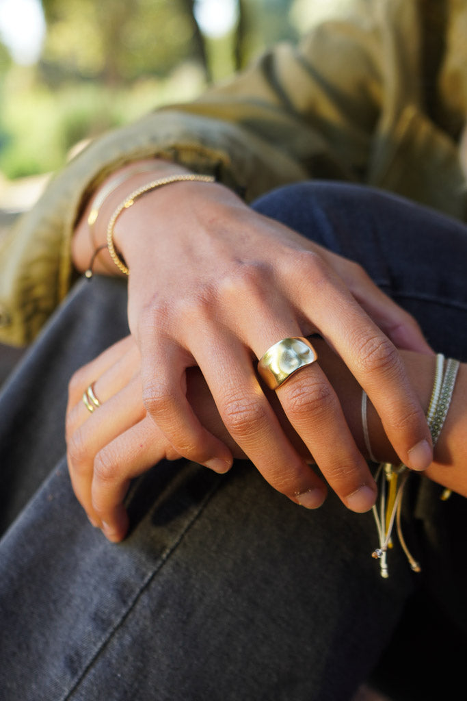 Este anillo enchapado en oro destaca por su diseño grueso y su textura martillada, que refleja la luz de manera increíble. Es una pieza con mucha presencia, ideal para llevarla sola como protagonista o acompañada de bandas más finas para crear contrastes.
