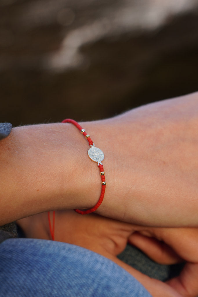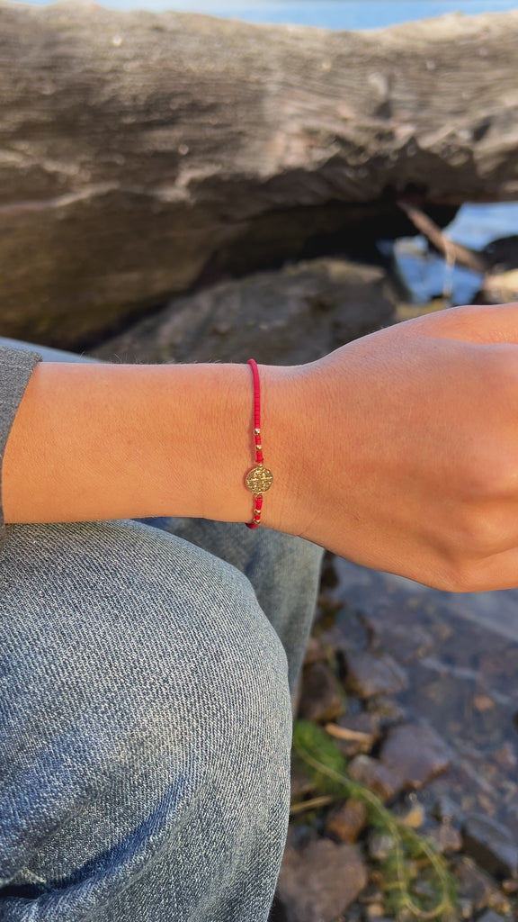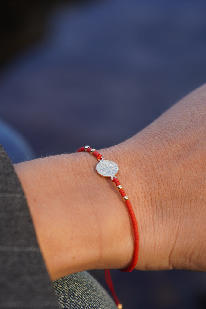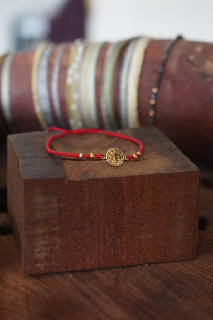 Pulsera de mostacillas rojas ajustable con una medalla de San Benito en enchape de oro. Es liviana y cómoda, ideal para usar todos los días.