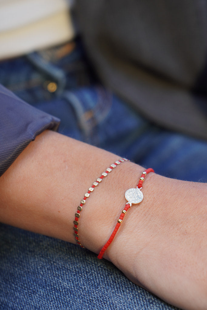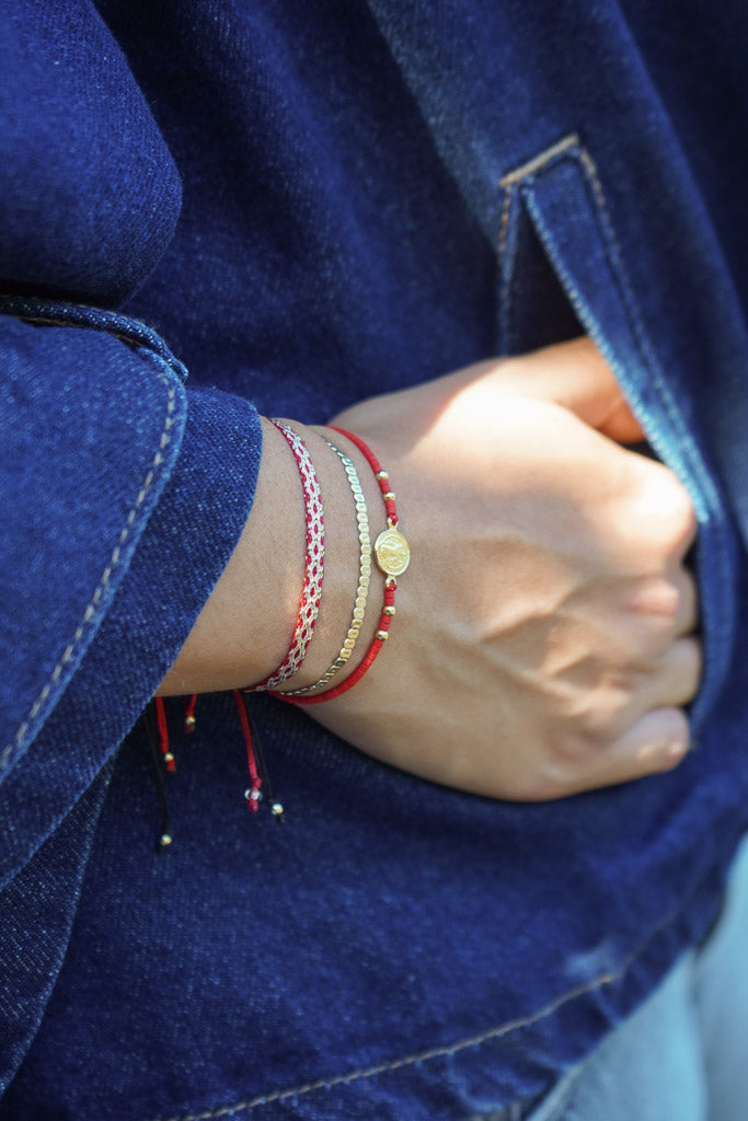 PULSERA SAN BENITO MOSTACILLAS ROJAS ENCHAPE ORO
