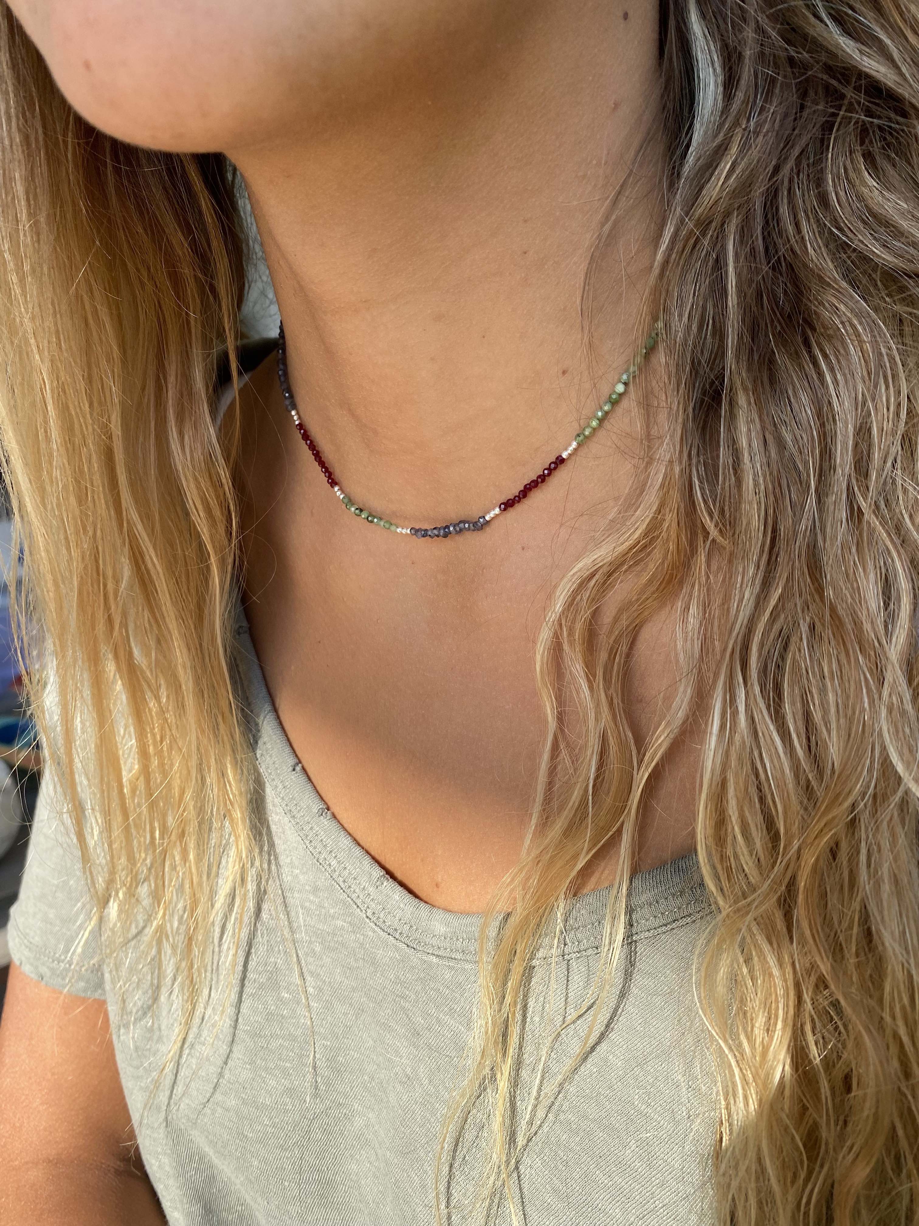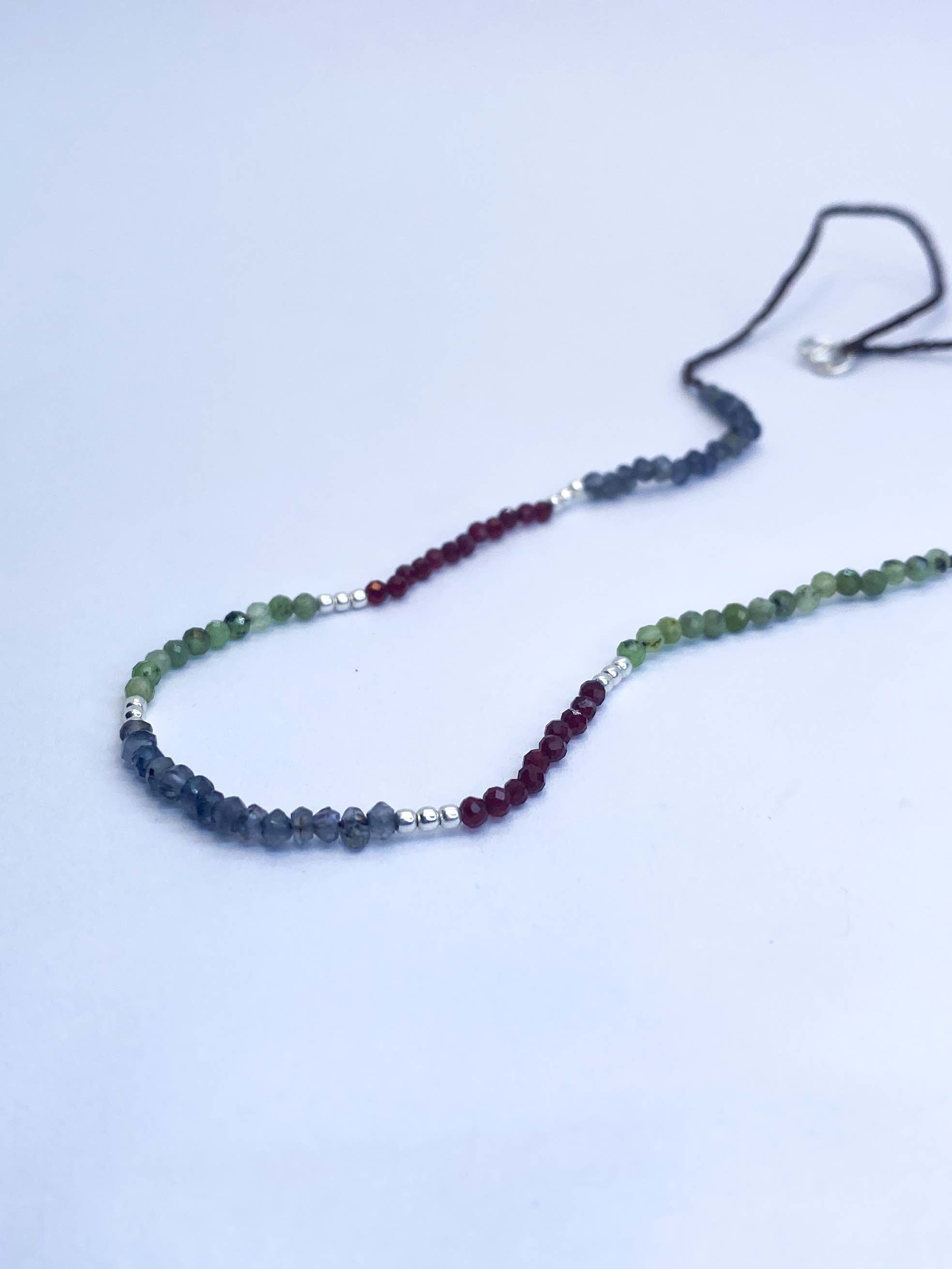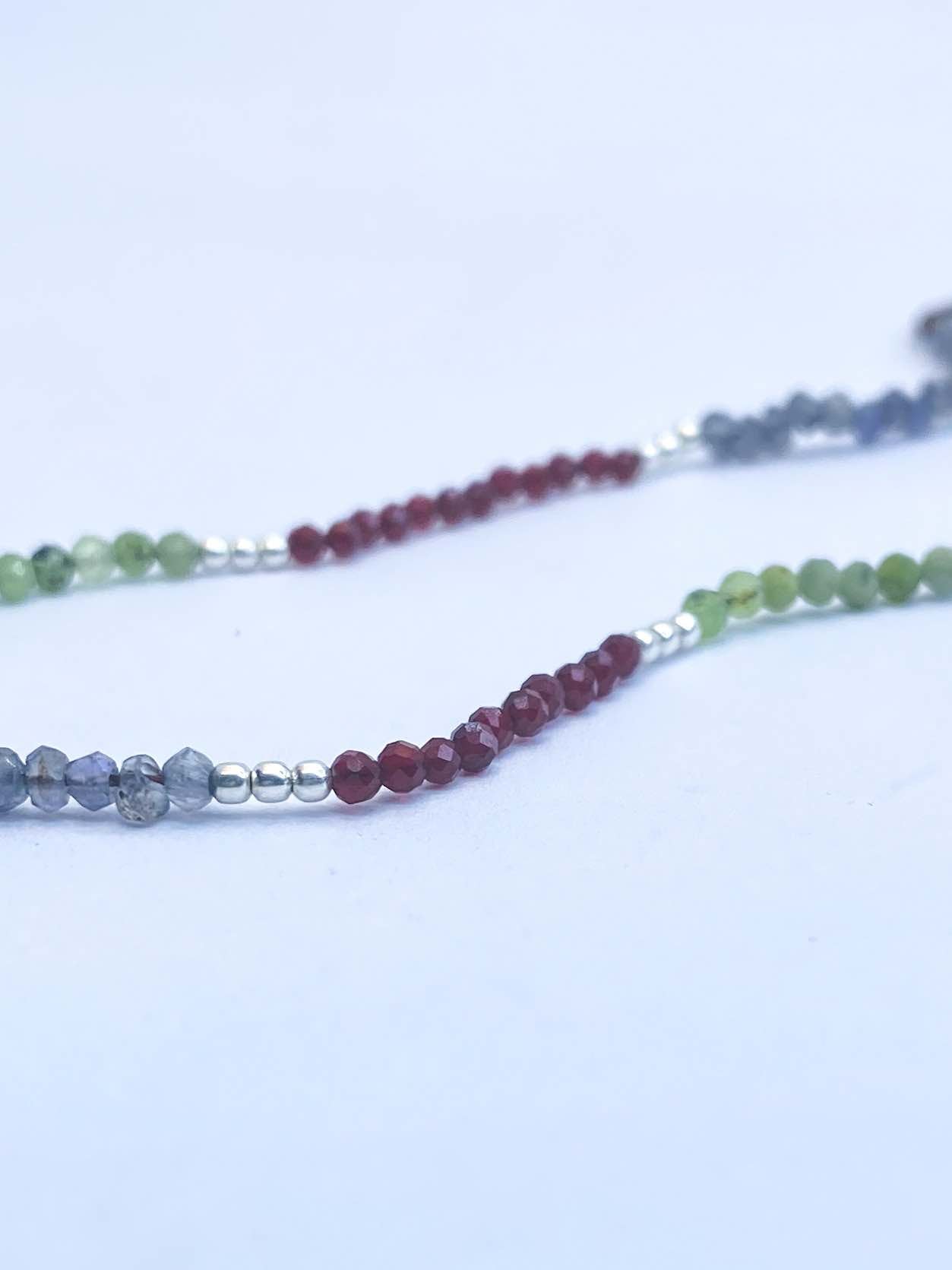 Collar tejido con iolitas, piedras lunas, granates y bolitas de plata largo apox. 40 cms y 5 cms de alargue de plata