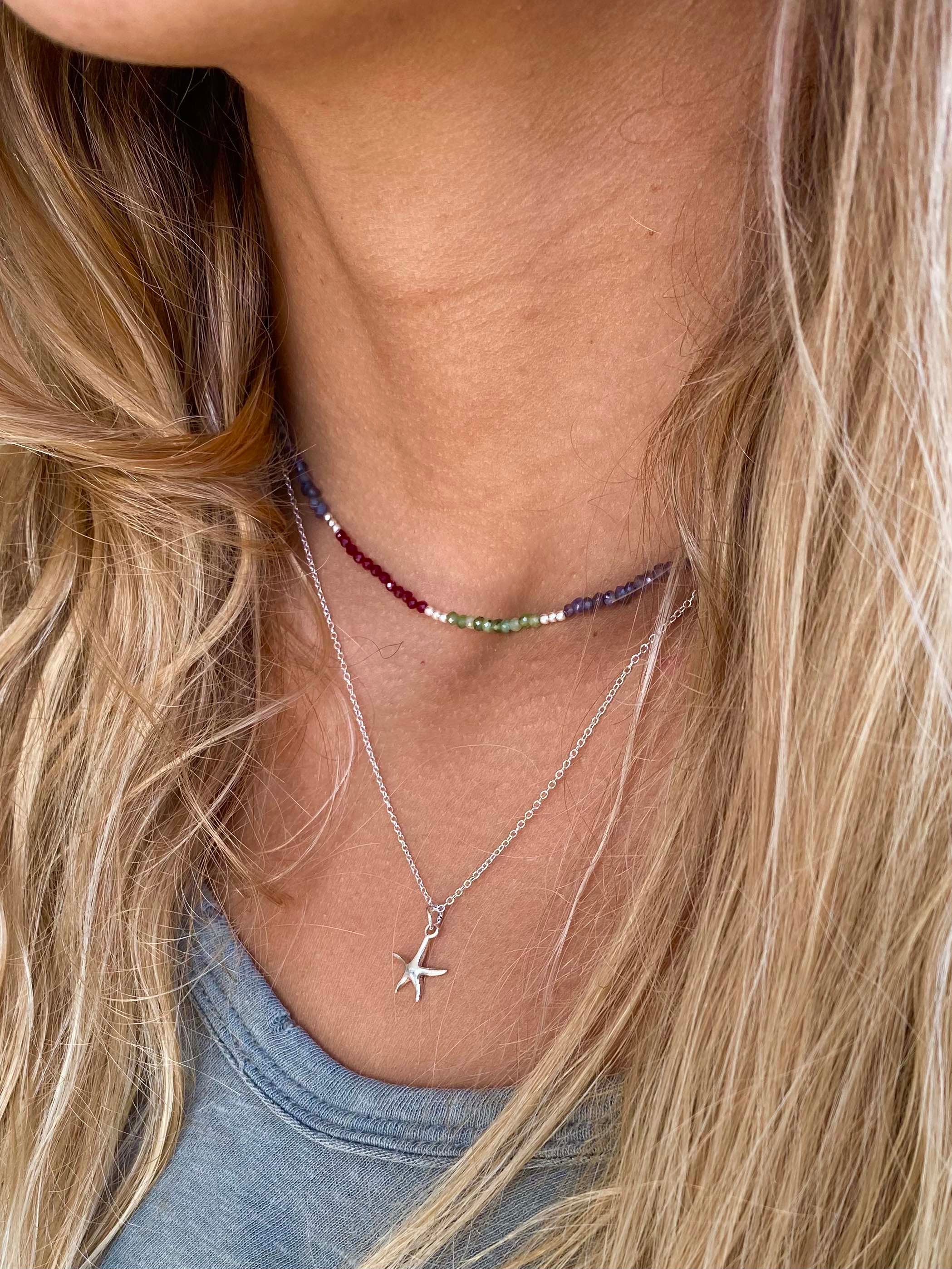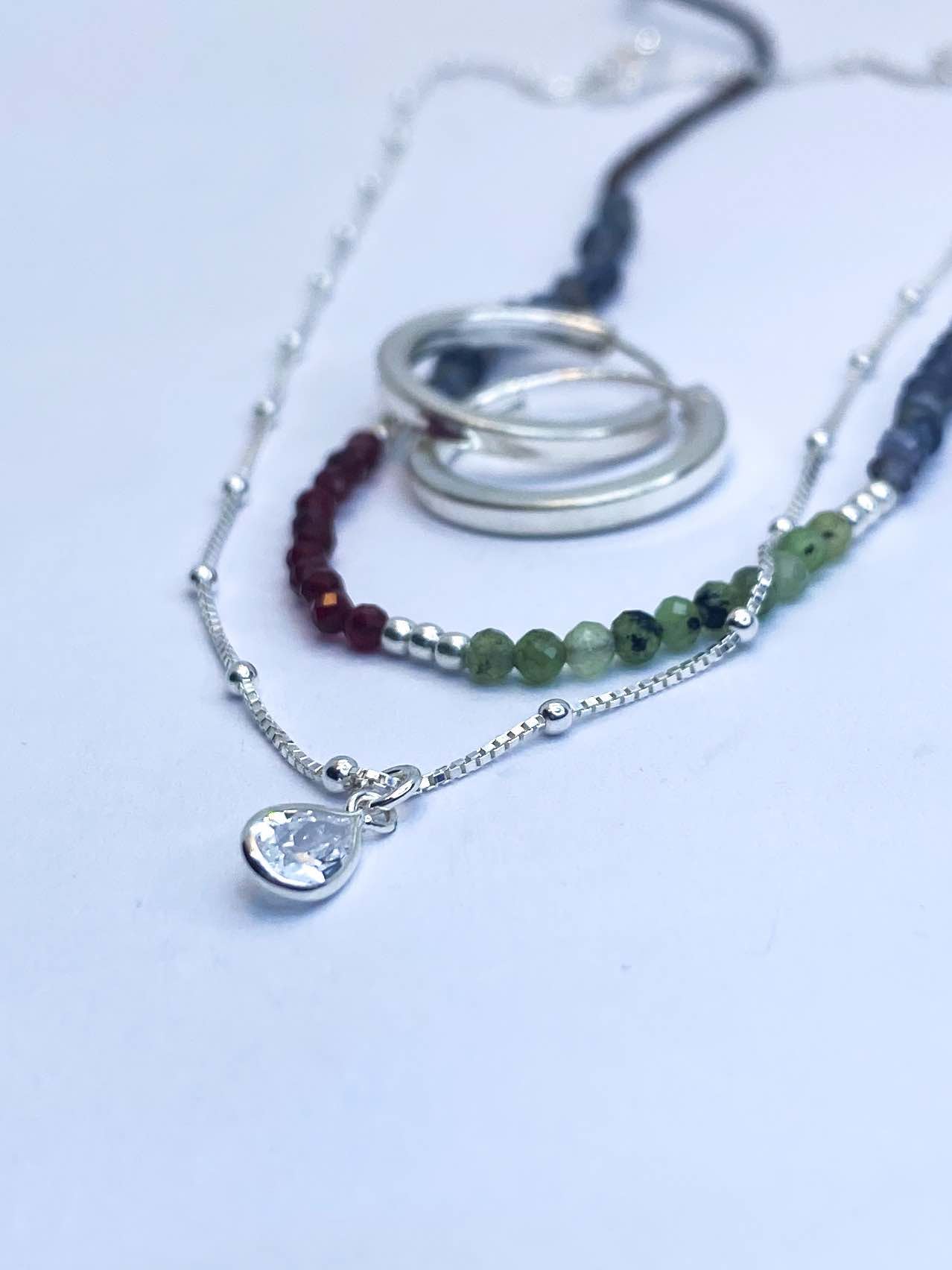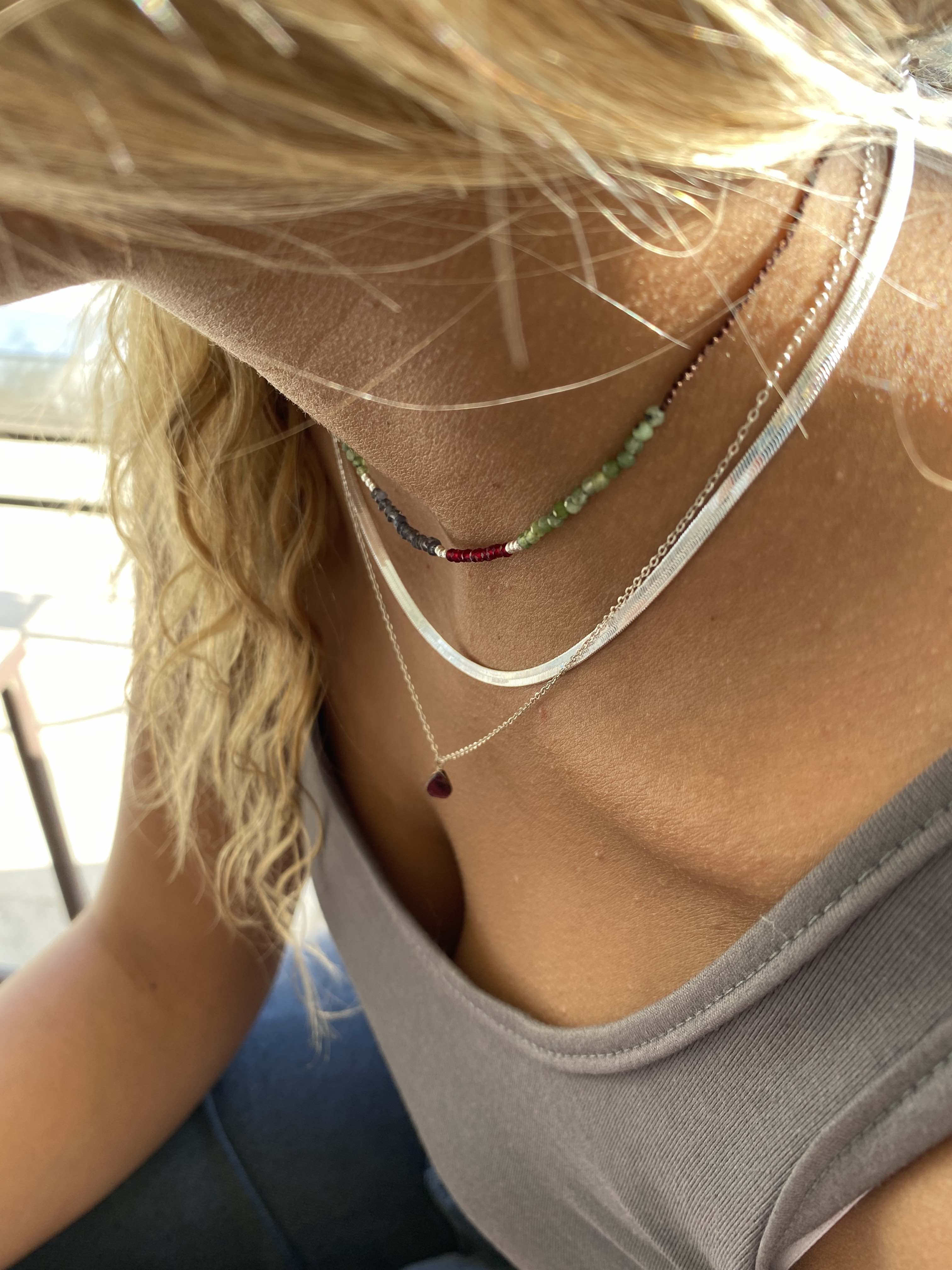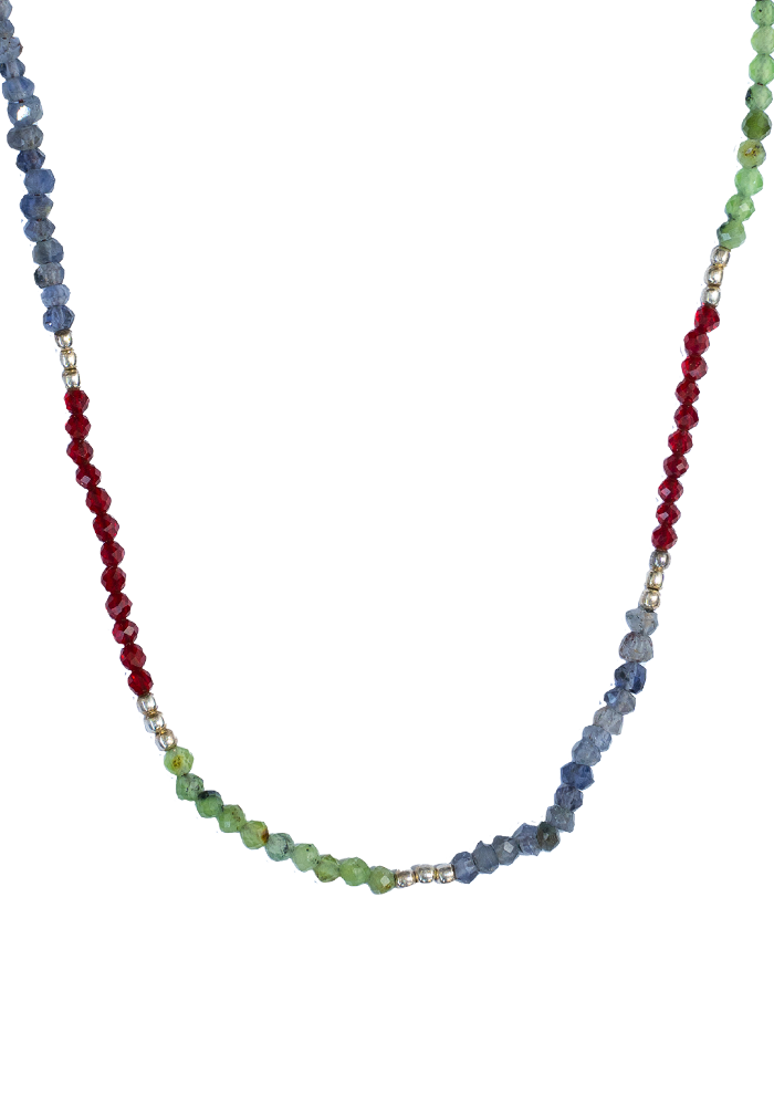 Collar tejido con iolitas, piedras lunas, granates y bolitas de plata largo apox. 40 cms y 5 cms de alargue de plata