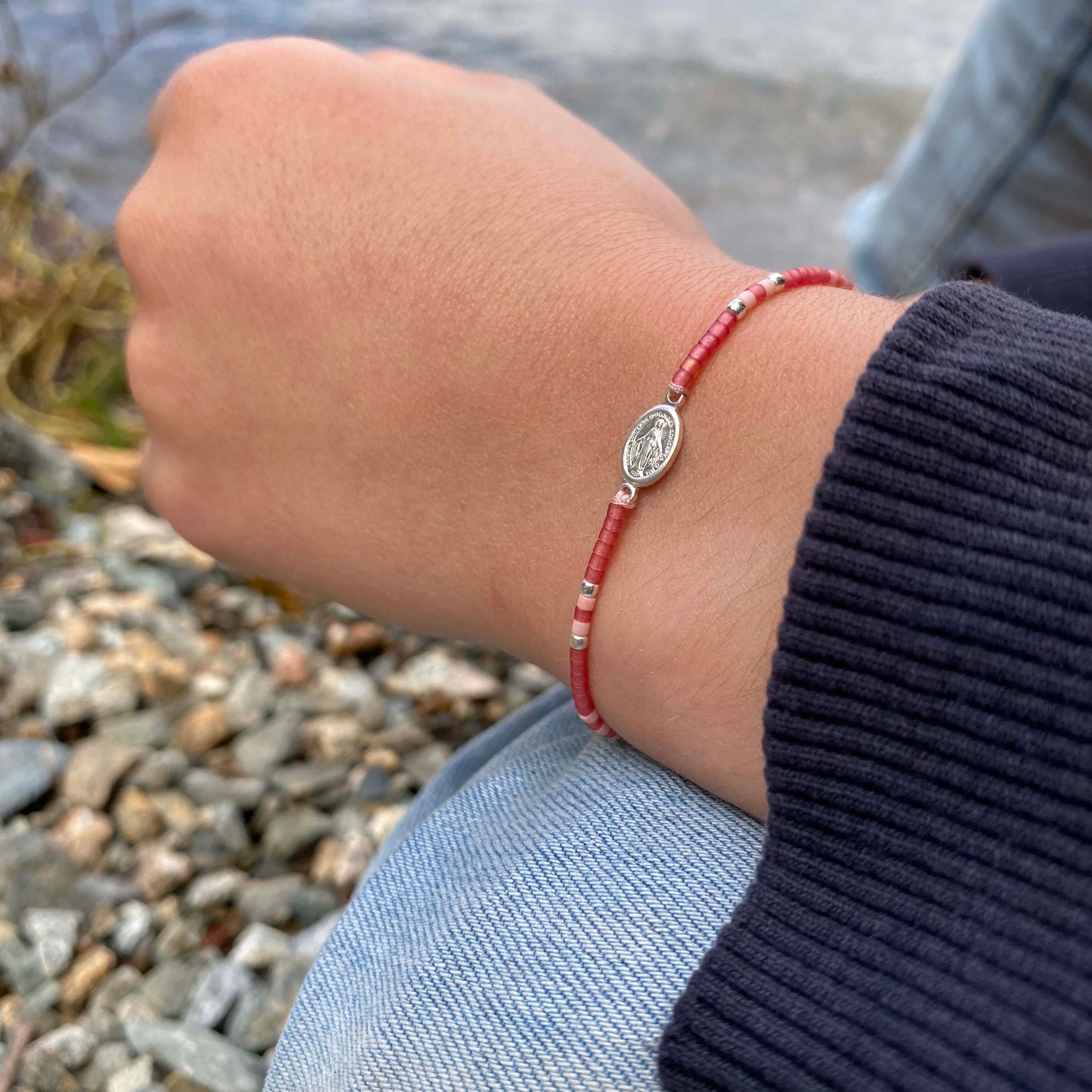 PULSERA MACRAMÉ VIRGEN MINI ROJA PLATA