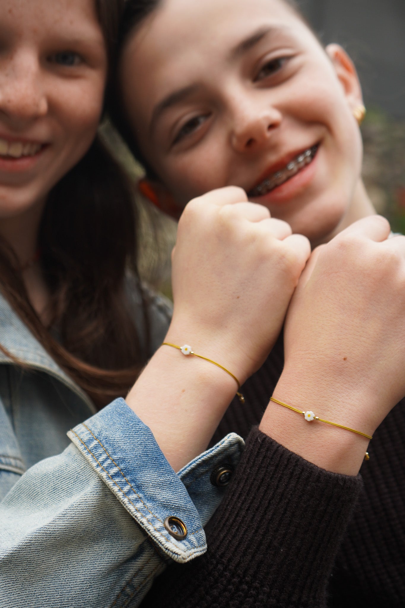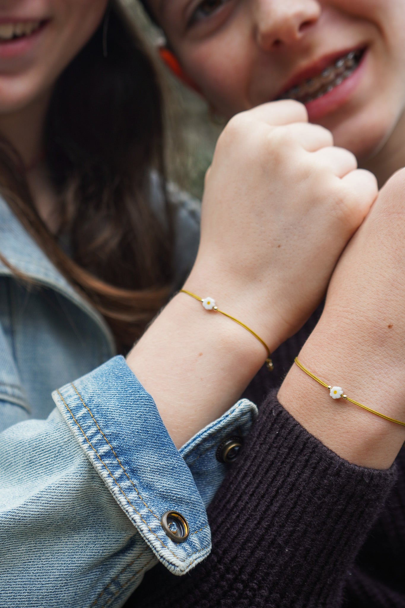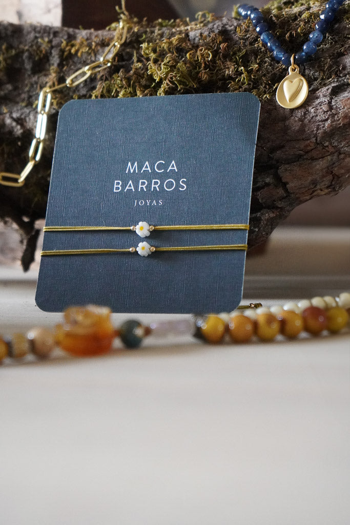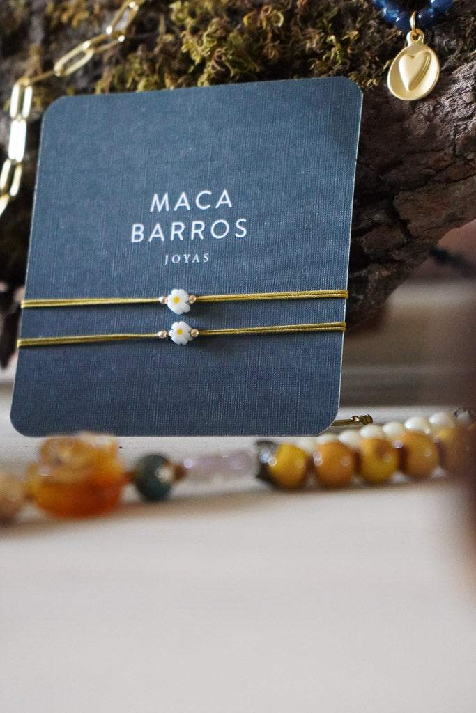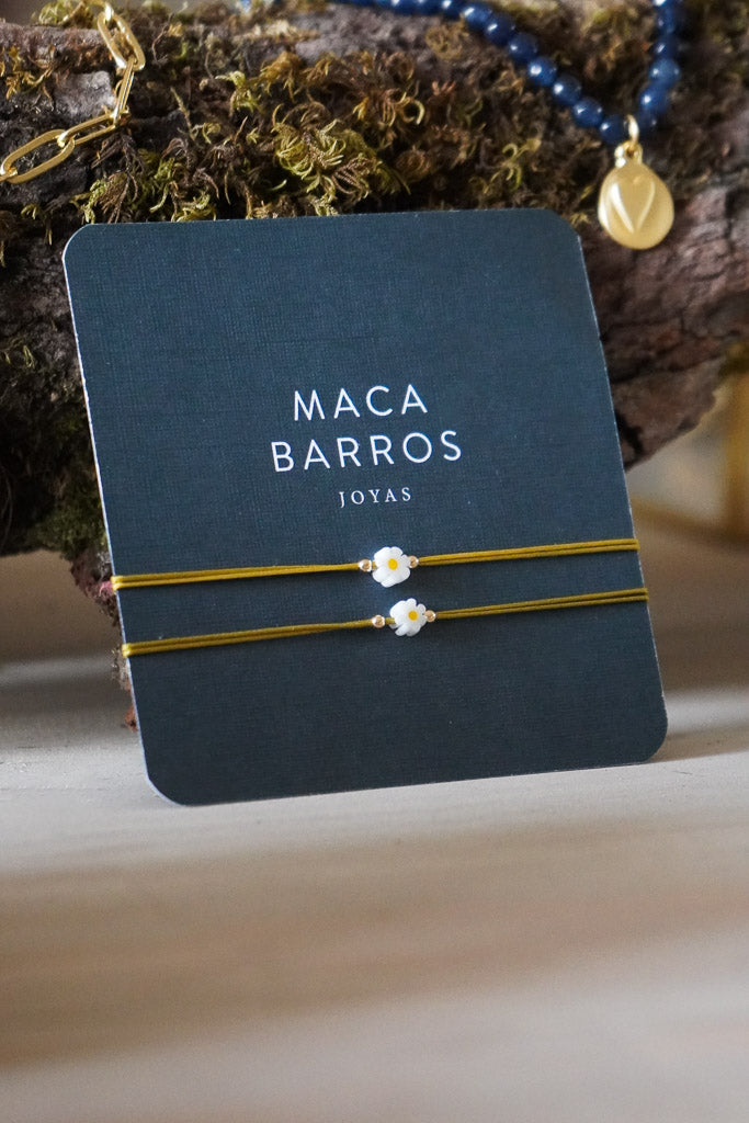 Set de dos pulseras con delicadas margaritas al centro, creadas para quienes quieren estar juntas por siempre y llevar un toque alegre y fresco en su día a día.
