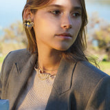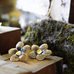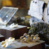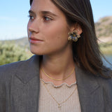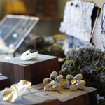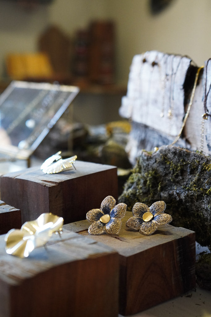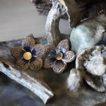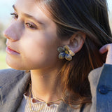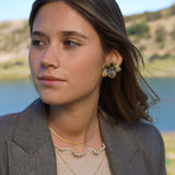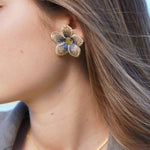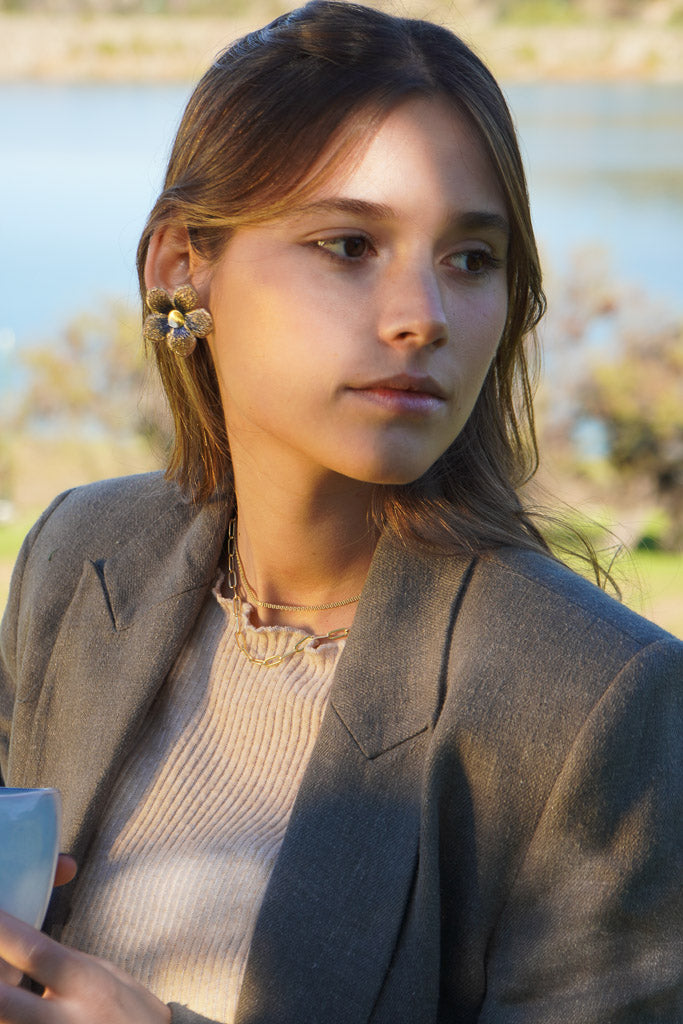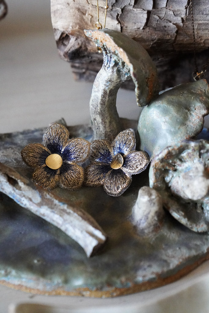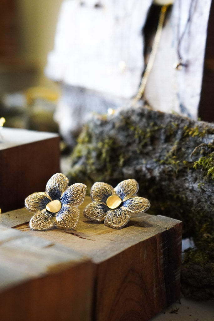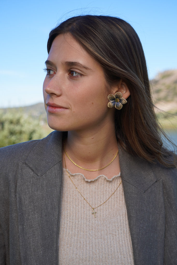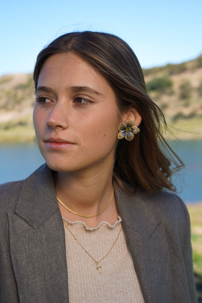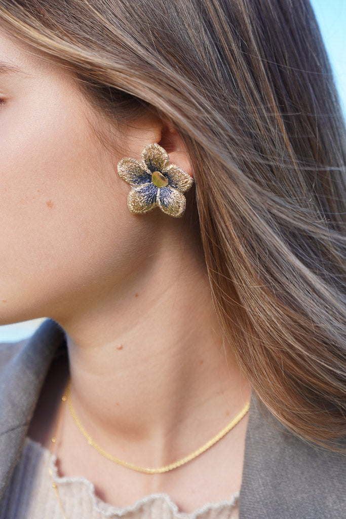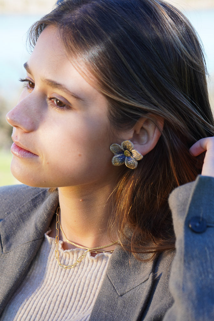 Estos aros en forma de flor están confeccionados a partir de una delicada tela con sutiles tonos azulados y centro en enchape de oro. Son el detalle perfecto para darle un toque especial a tu outfit sin dejar de ser fiel a tu estilo.