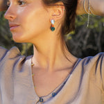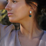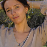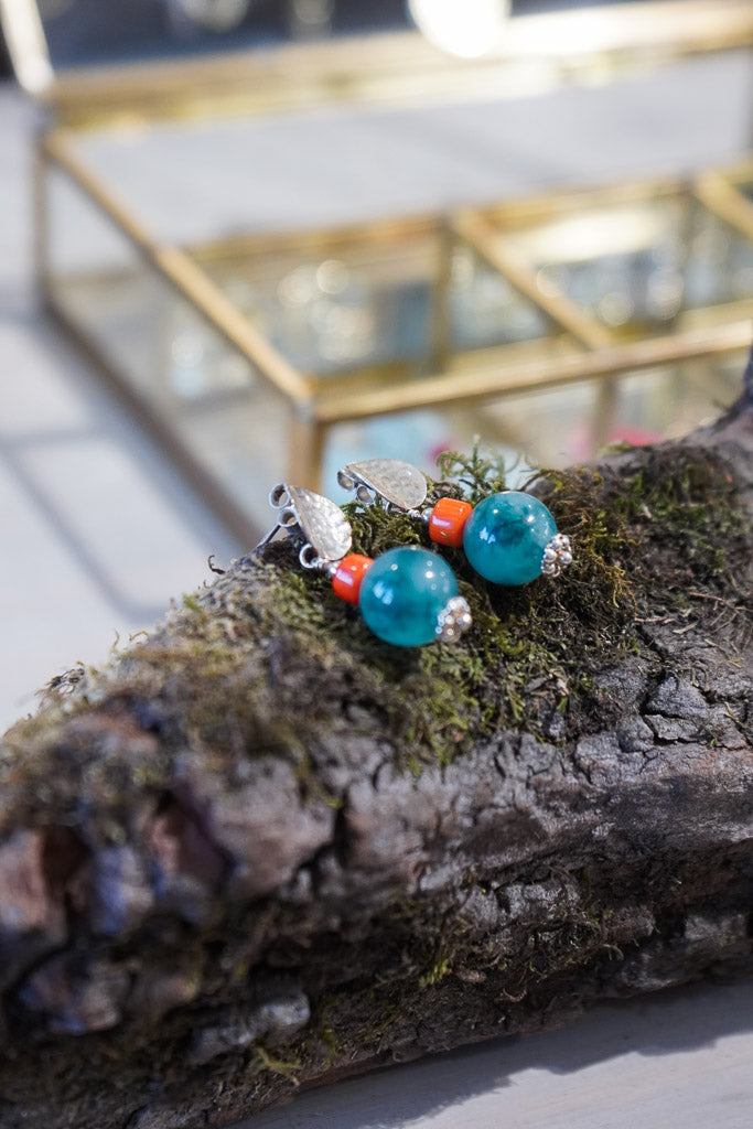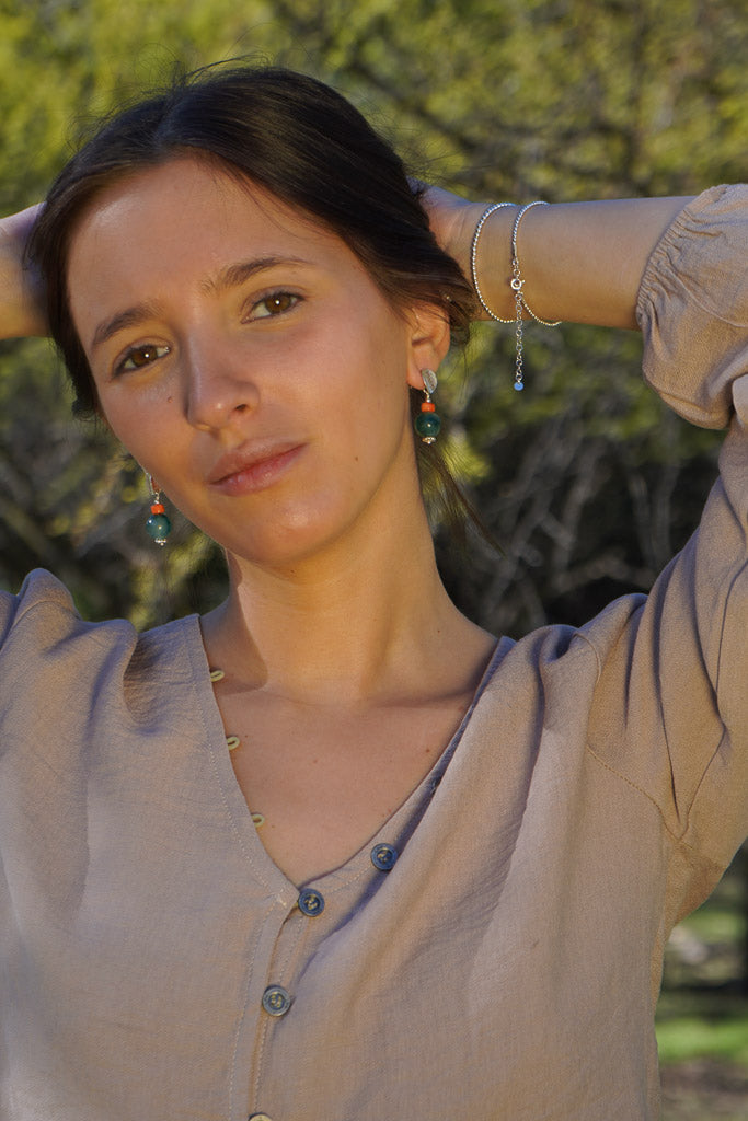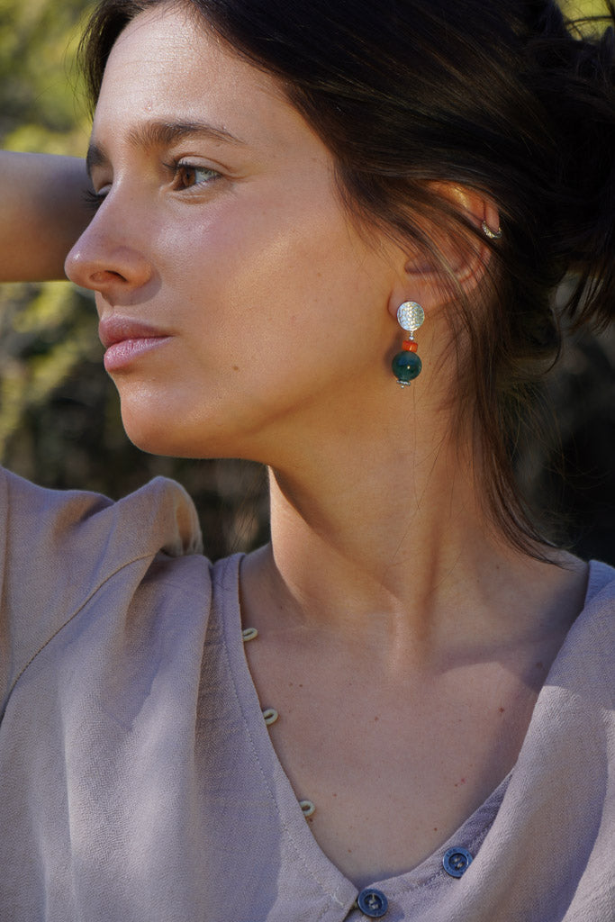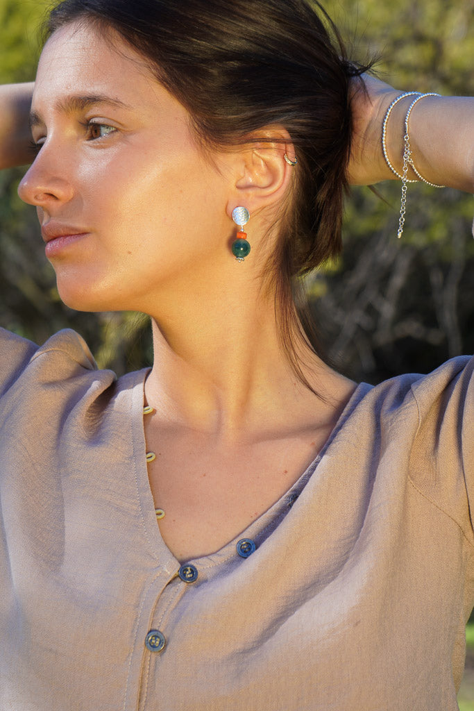 Aros llenos de buena vibra y color. Las piedras verdes y detalles en naranjo crean una combinación fresca y divertida, perfecta para darle vida a cualquier look. Livianos y cómodos.