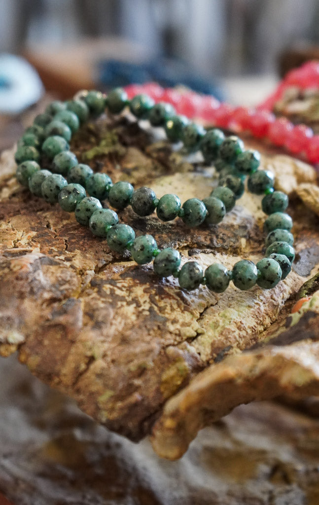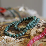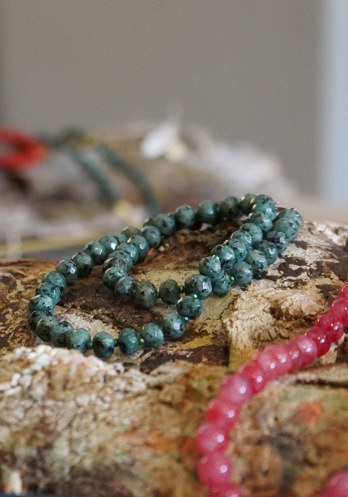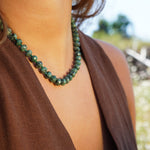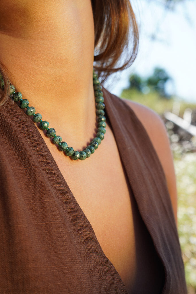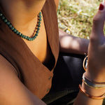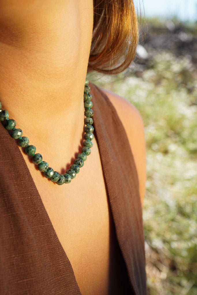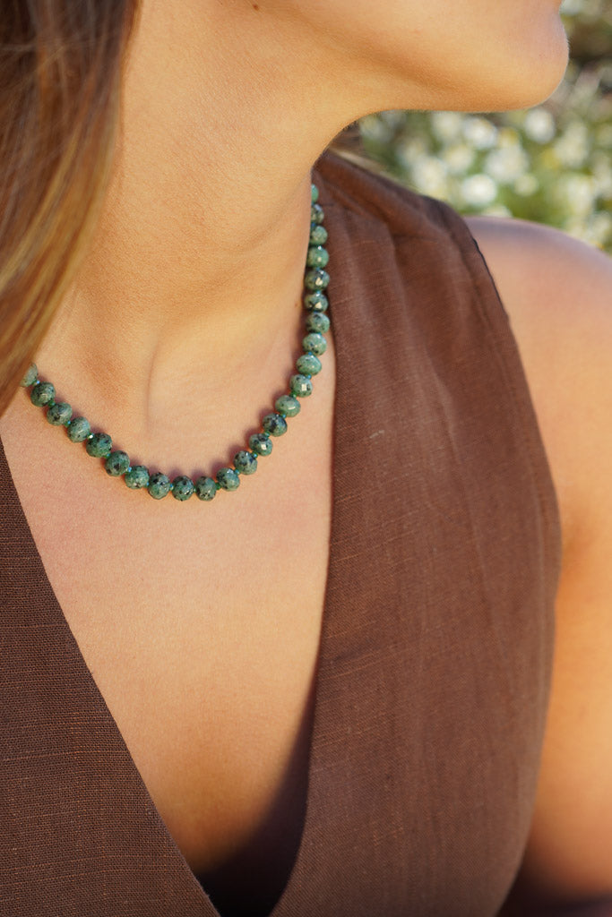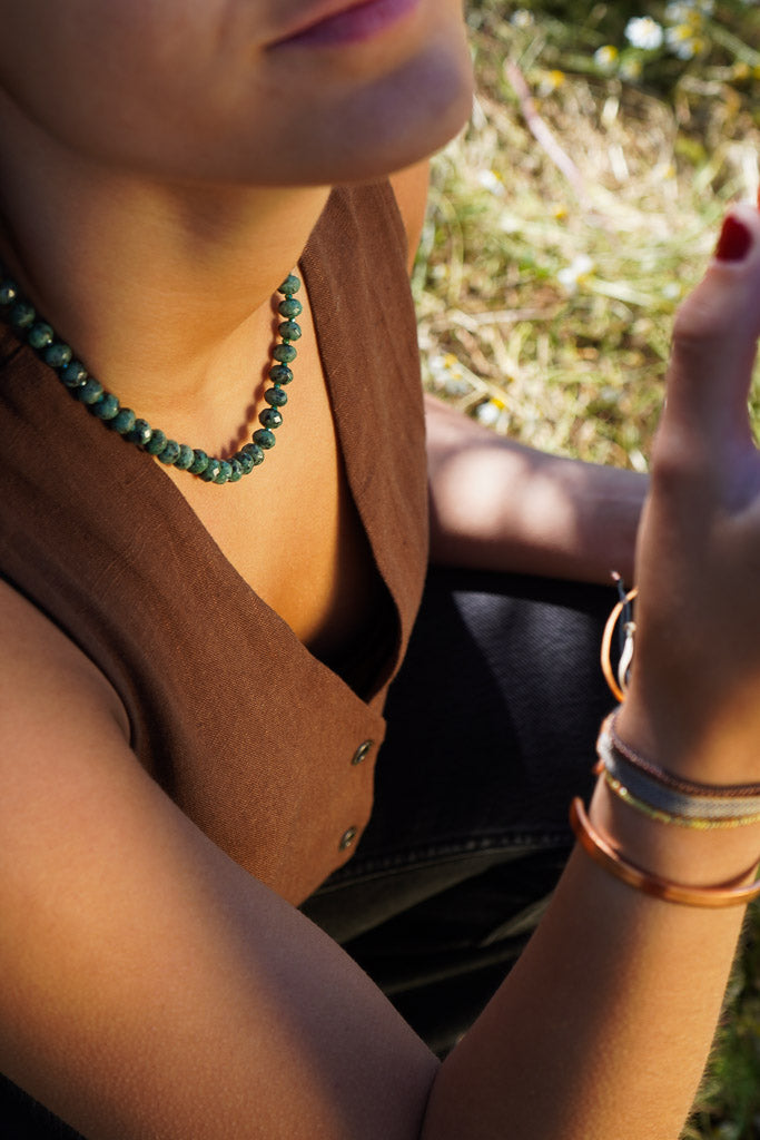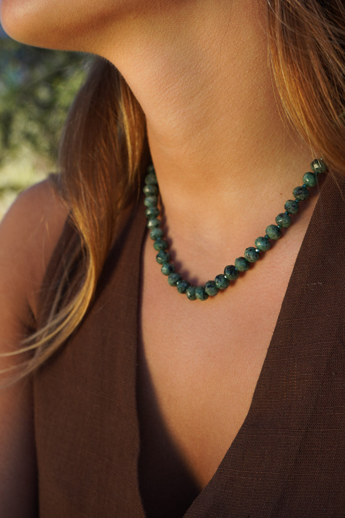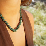 Collar de piedras en tonos verde jaspeado. Tiene un brillo discreto y una forma suave e irregular que lo hace muy fácil de combinar. Es ligero, cómodo y perfecto para sumar un toque distinto sin recargar.