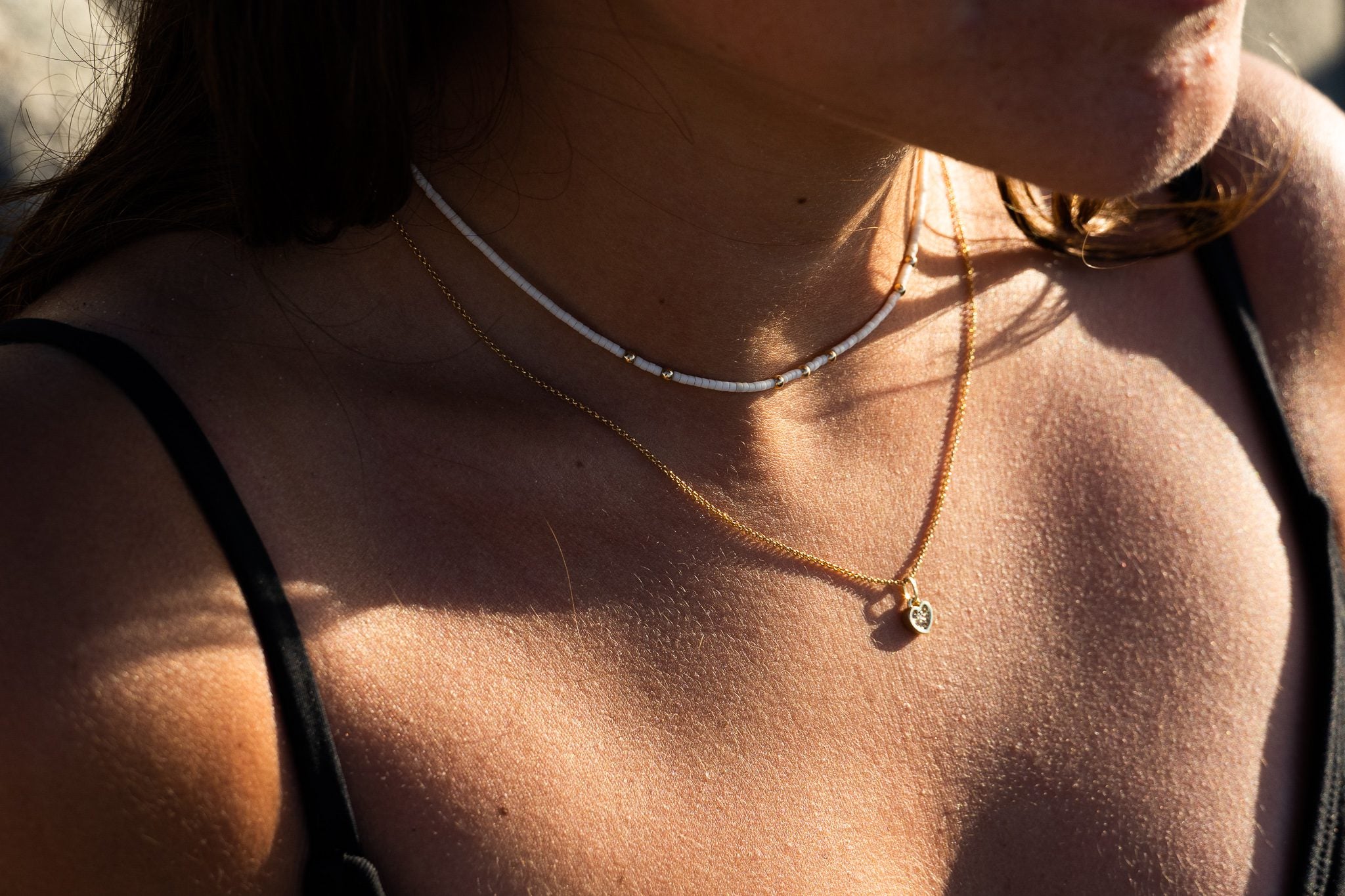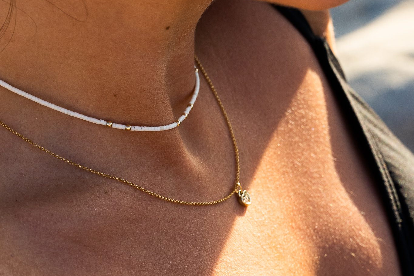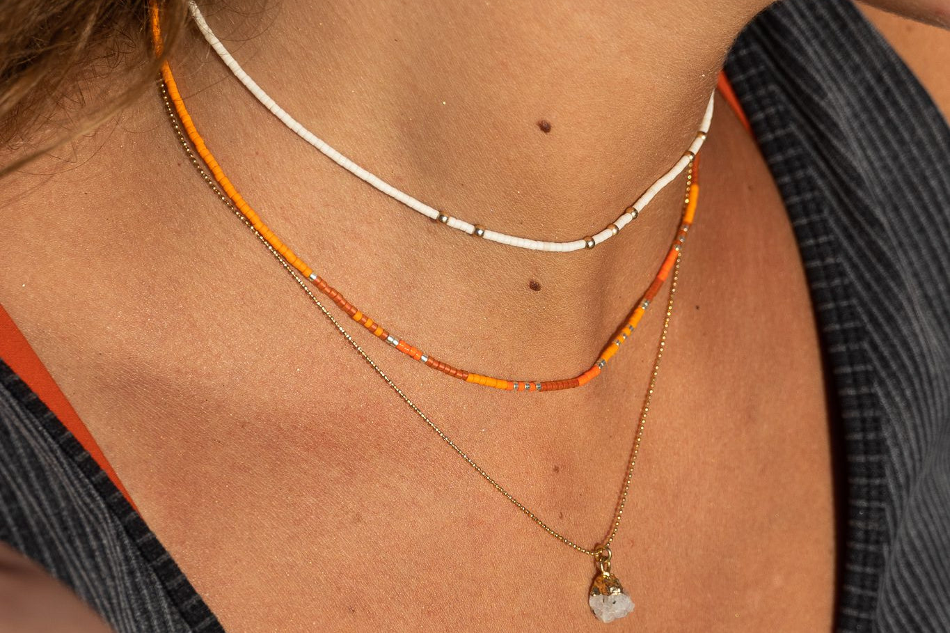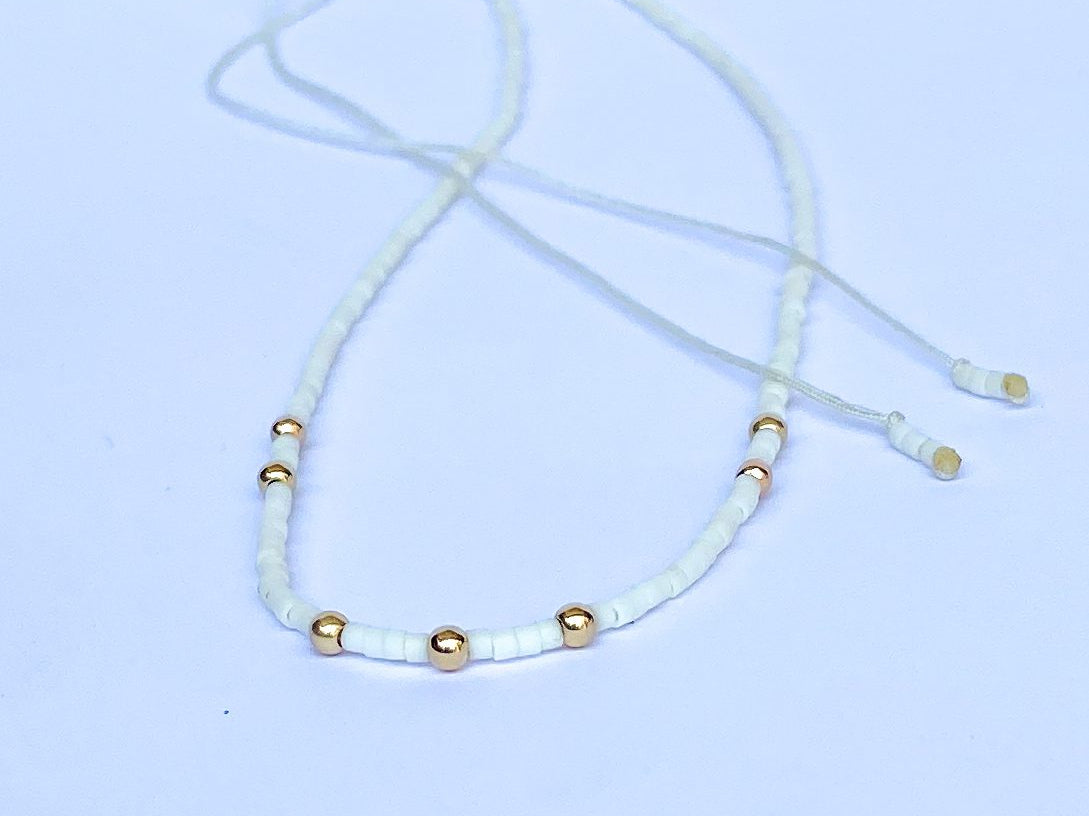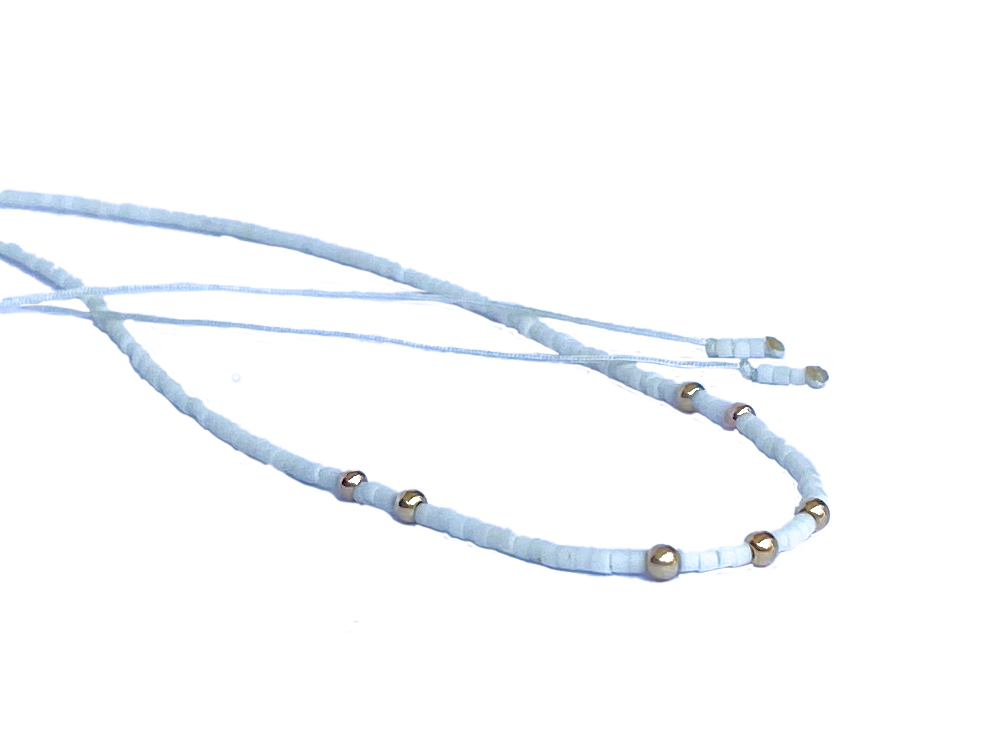 Este collar ajustable en color blanco está hecho con material de alta calidad, goldfilled y mostacillas miyuki. Su elegante diseño y cierre con bolitas de goldfilled lo convierten en el complemento perfecto para cualquier ocasión. ¡Ajustable a cualquier medida!