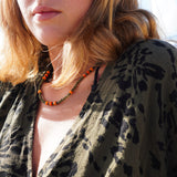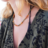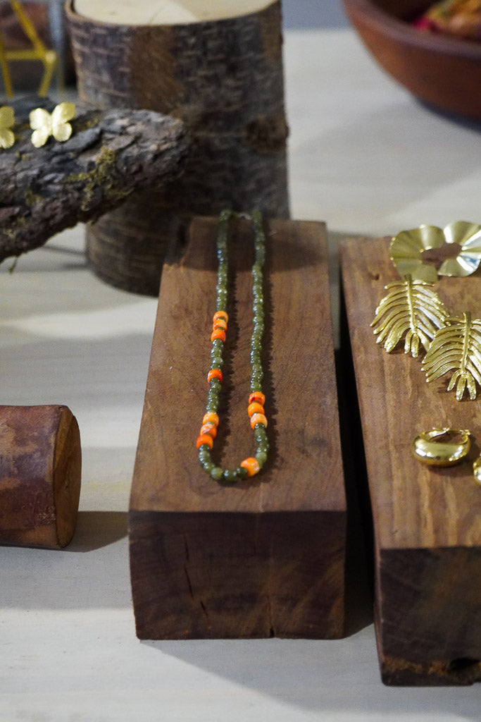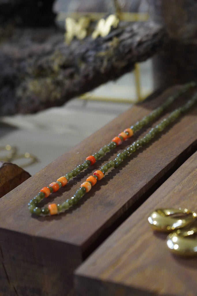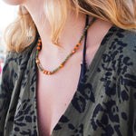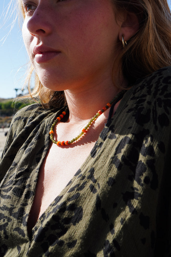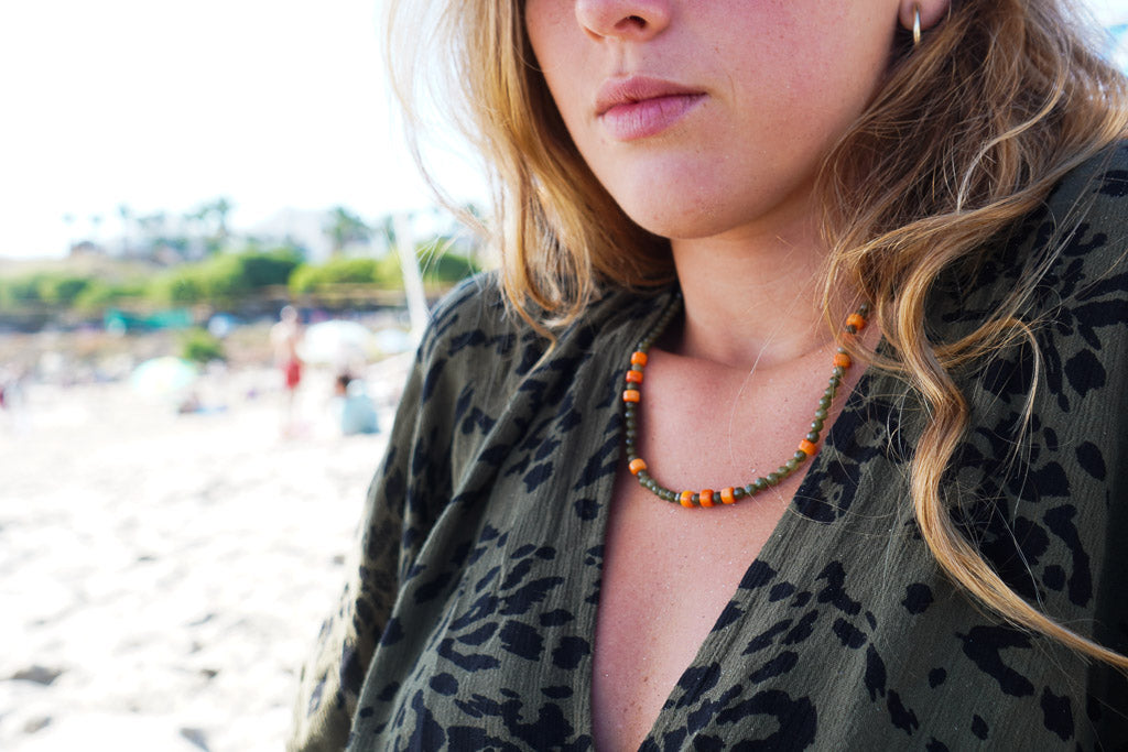 Este collar de piedras naturales en tonos verdes y naranjas combina frescura y energía. Los colores vibrantes y la textura lo hacen ideal para darle un toque alegre y distintivo a cualquier outfit. Hecho a mano con materiales de calidad, perfecto para usar solo o en capas con otro de nuestros collares.