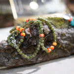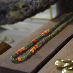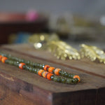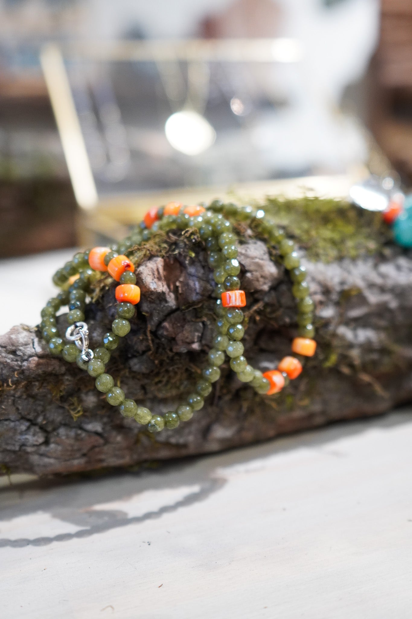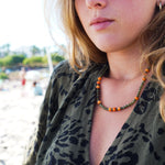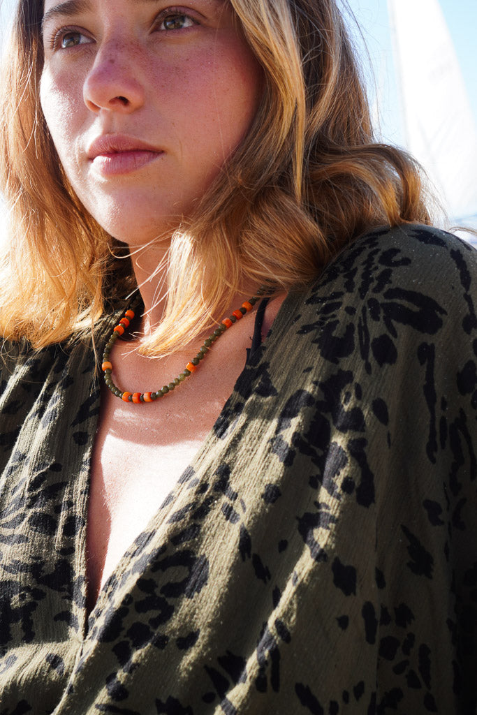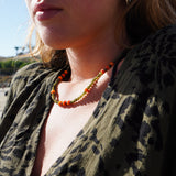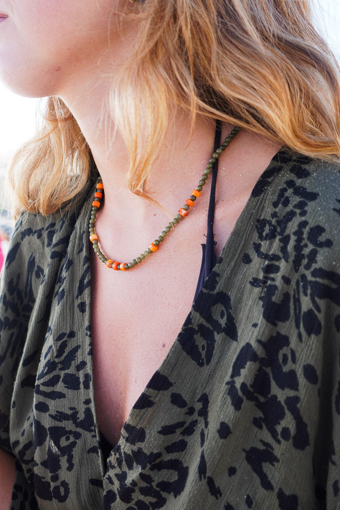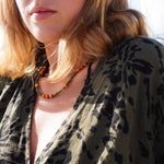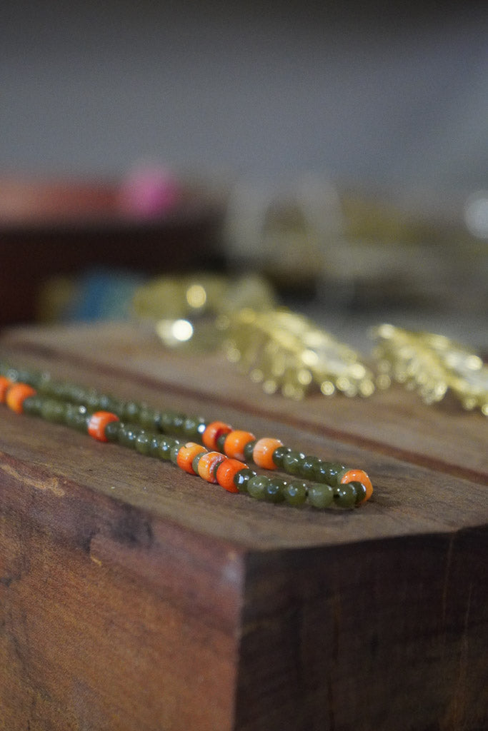 Este collar de piedras naturales en tonos verdes y naranjas combina frescura y energía. Los colores vibrantes y la textura lo hacen ideal para darle un toque alegre y distintivo a cualquier outfit. Hecho a mano con materiales de calidad, perfecto para usar solo o en capas con otro de nuestros collares.
