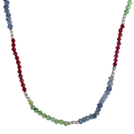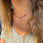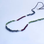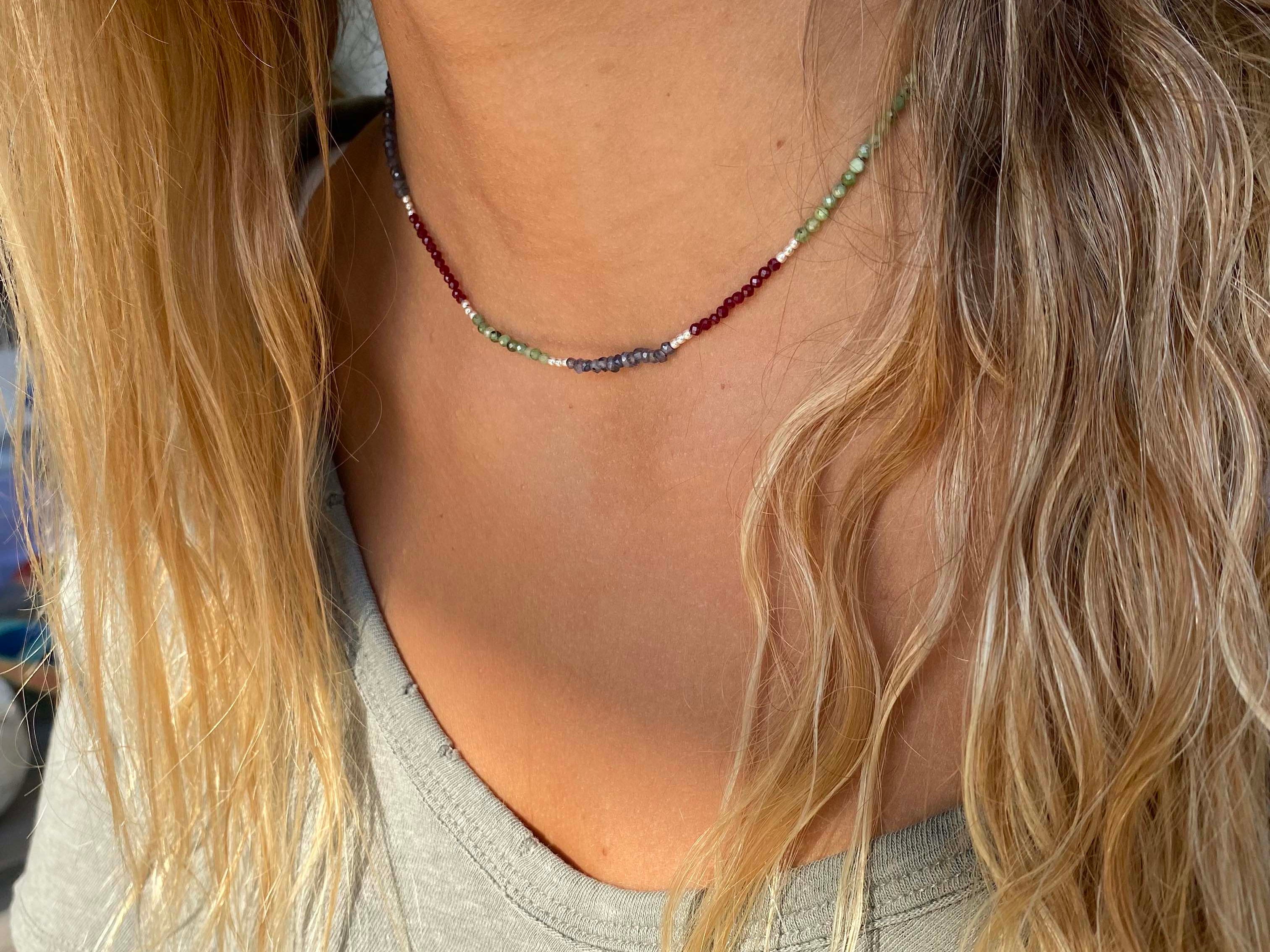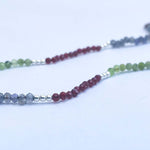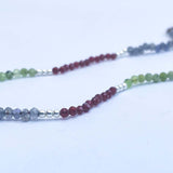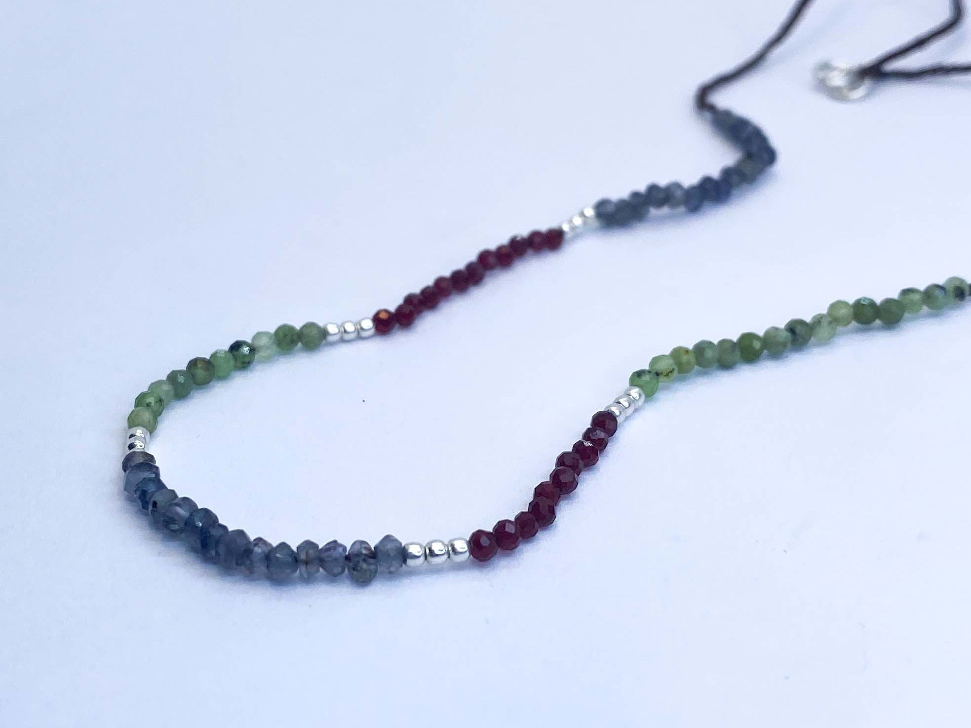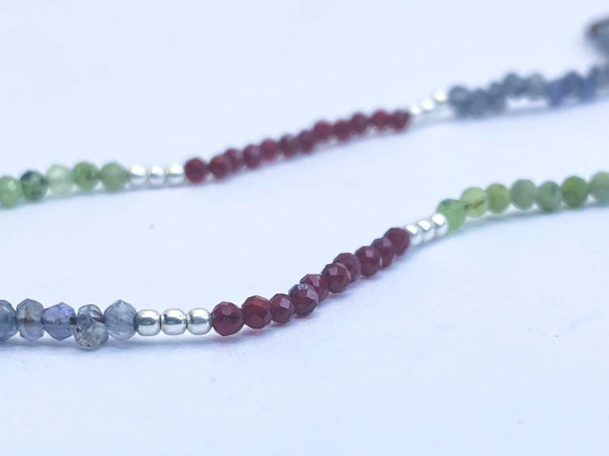 Collar tejido con iolitas, piedras lunas, granates y bolitas de plata largo apox. 40 cms y 5 cms de alargue de plata