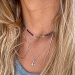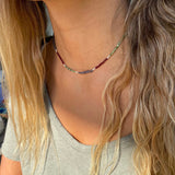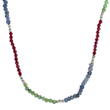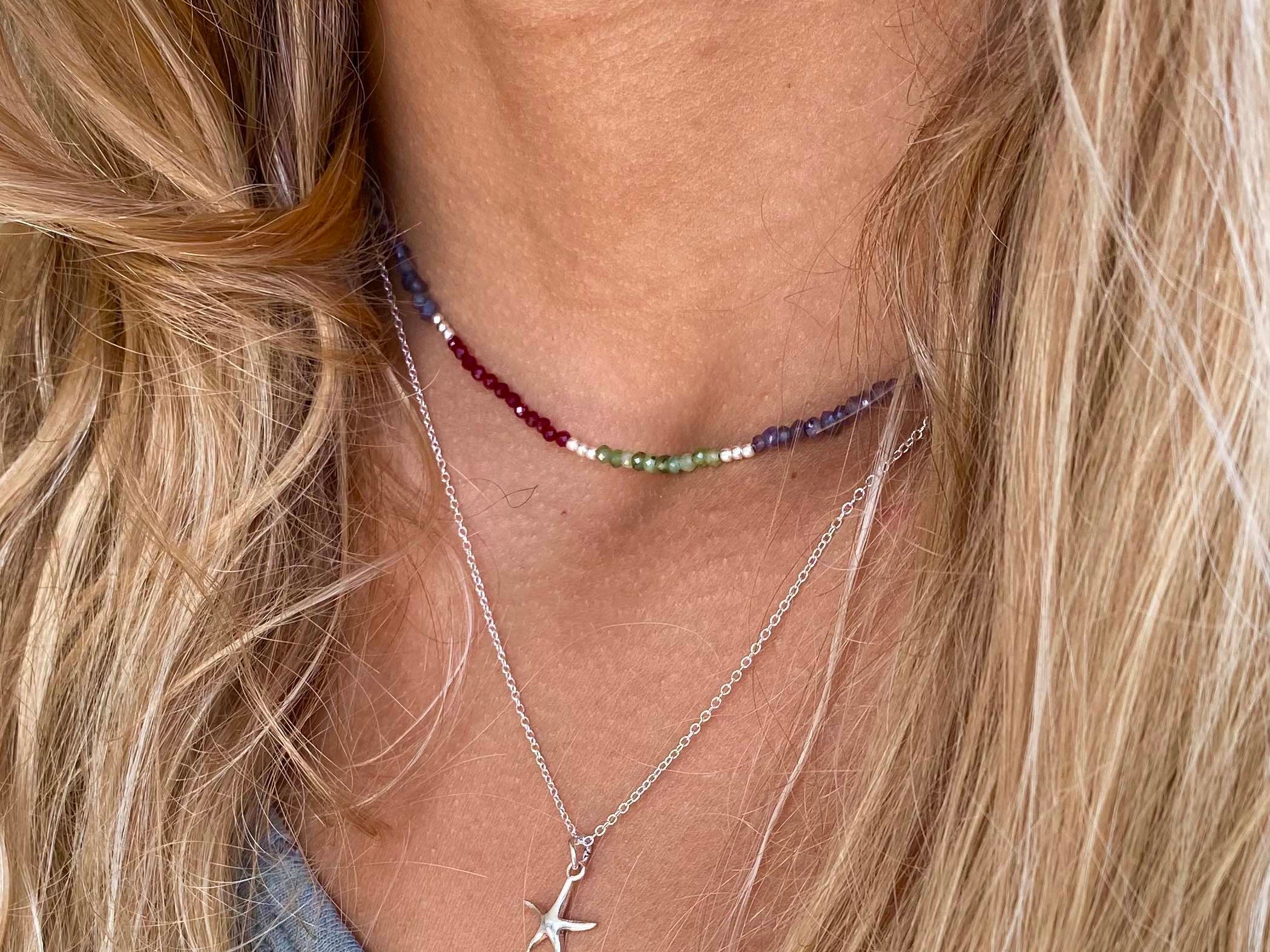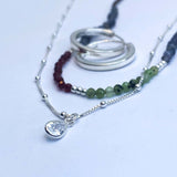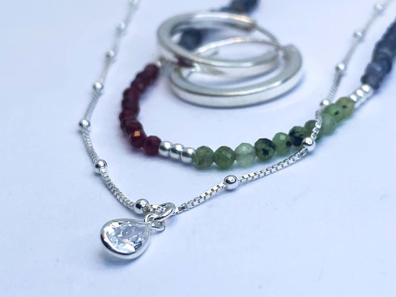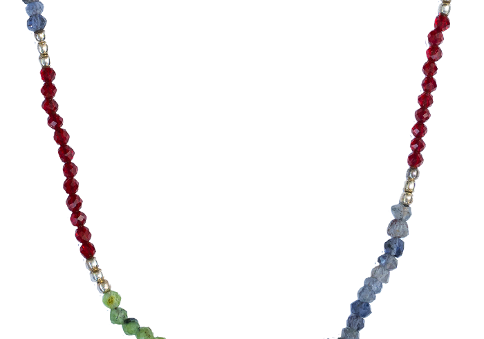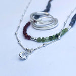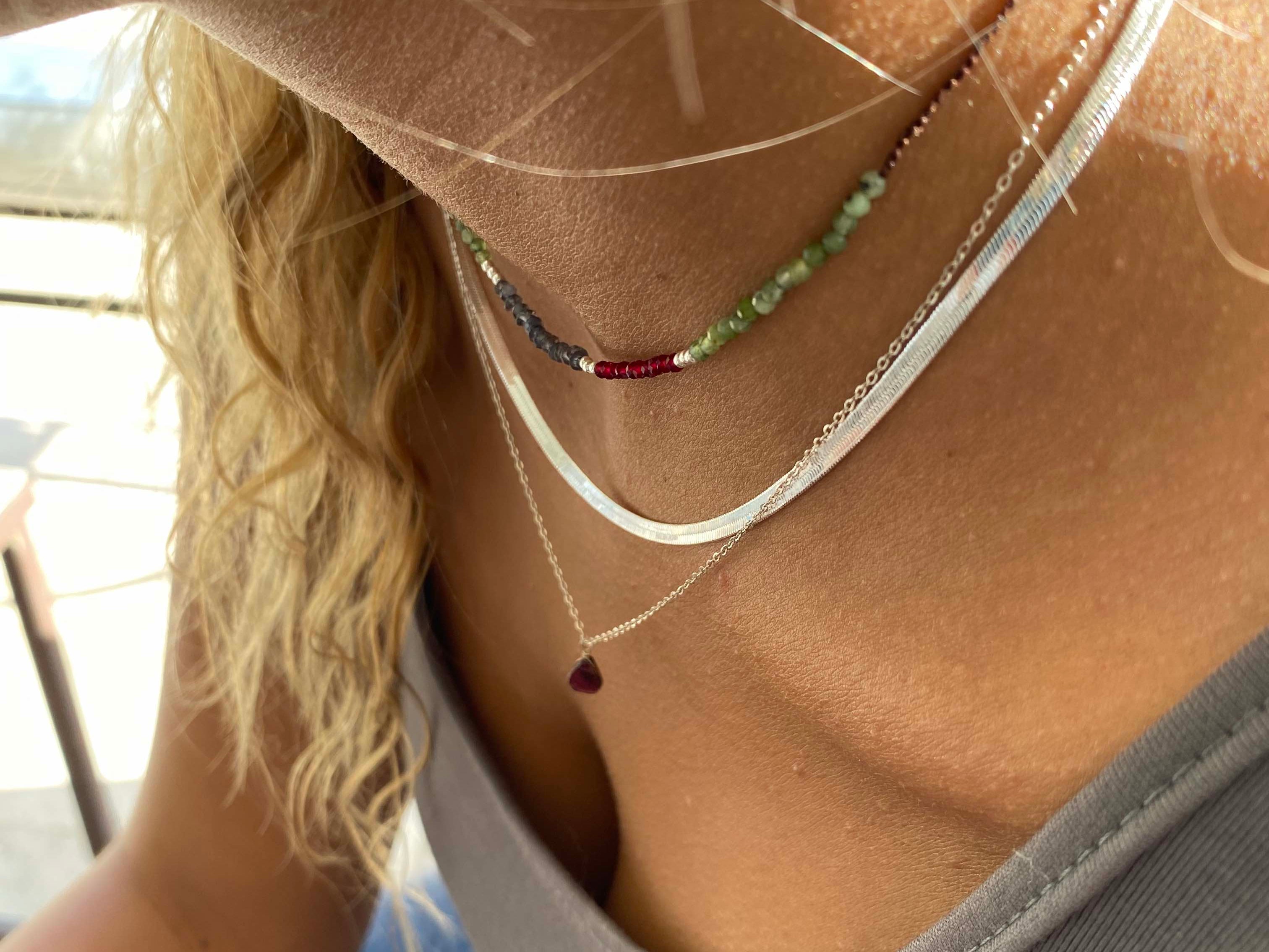 Collar tejido con iolitas, piedras lunas, granates y bolitas de plata largo apox. 40 cms y 5 cms de alargue de plata