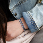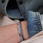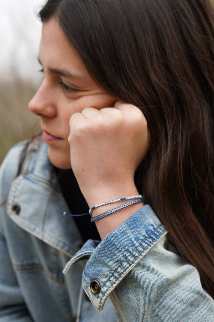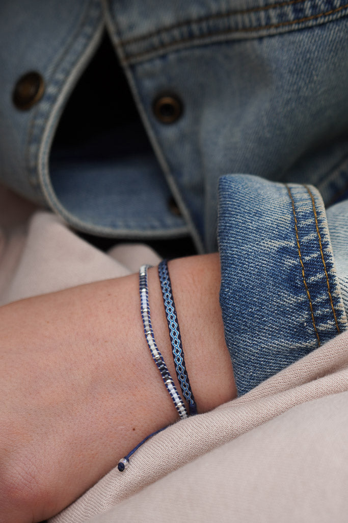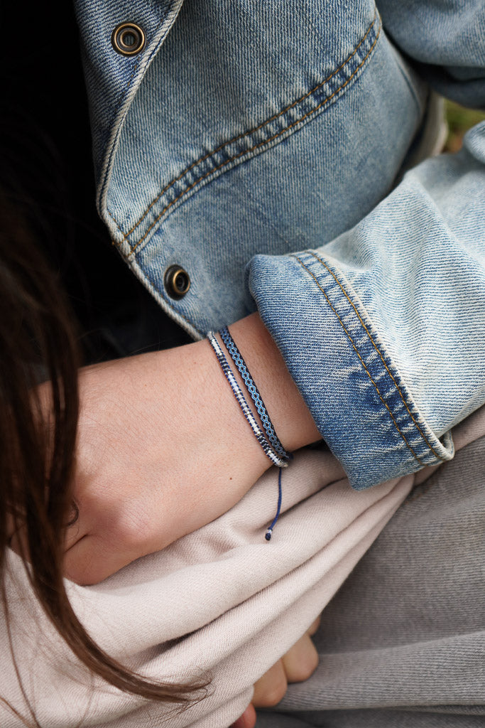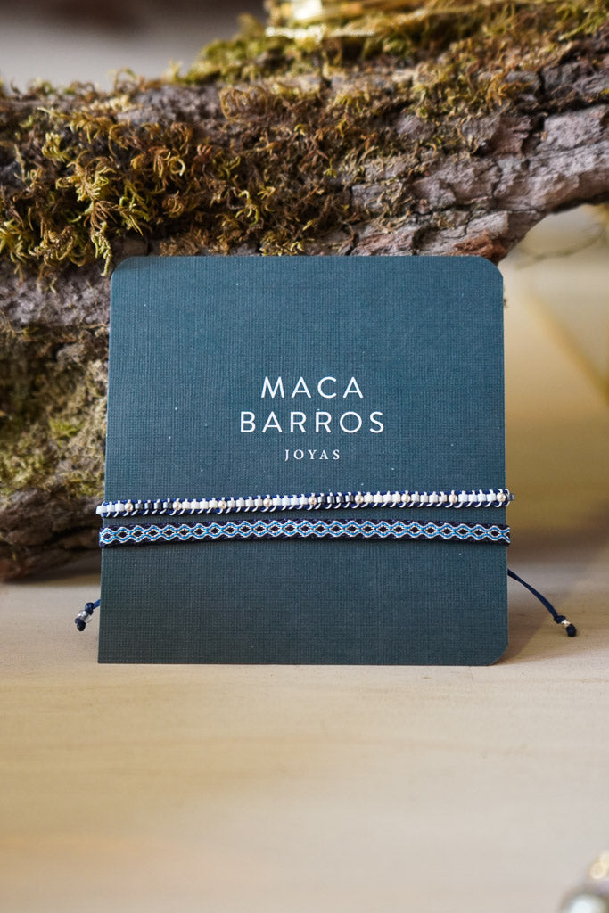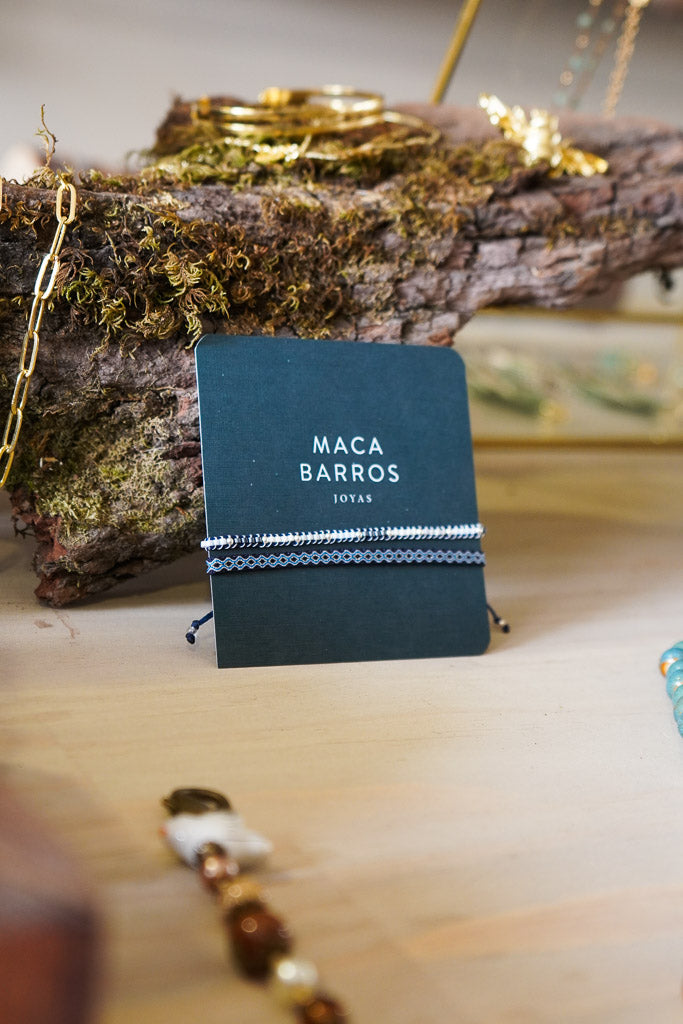 Pack de dos pulseras ajustables que se convierten en tu mix perfecto. Una hecha en telar con tonos azules y celestes, y la otra de mostacillas con detalles en plata 925. Súper combinables, cómodas y resistentes al agua, listas para acompañarte todos los días con estilo.
