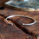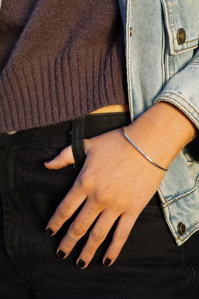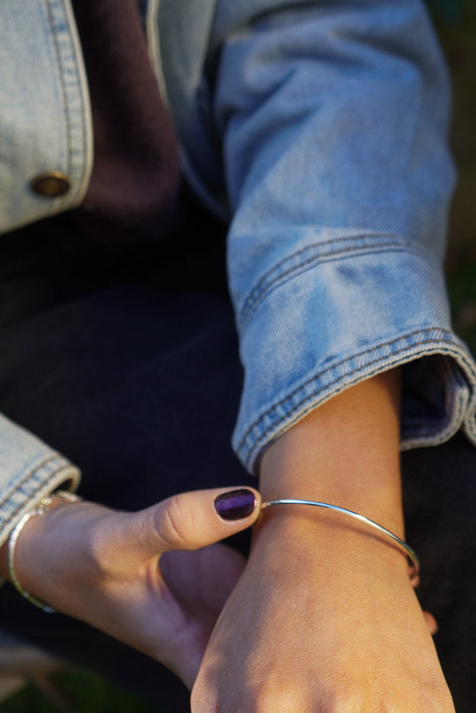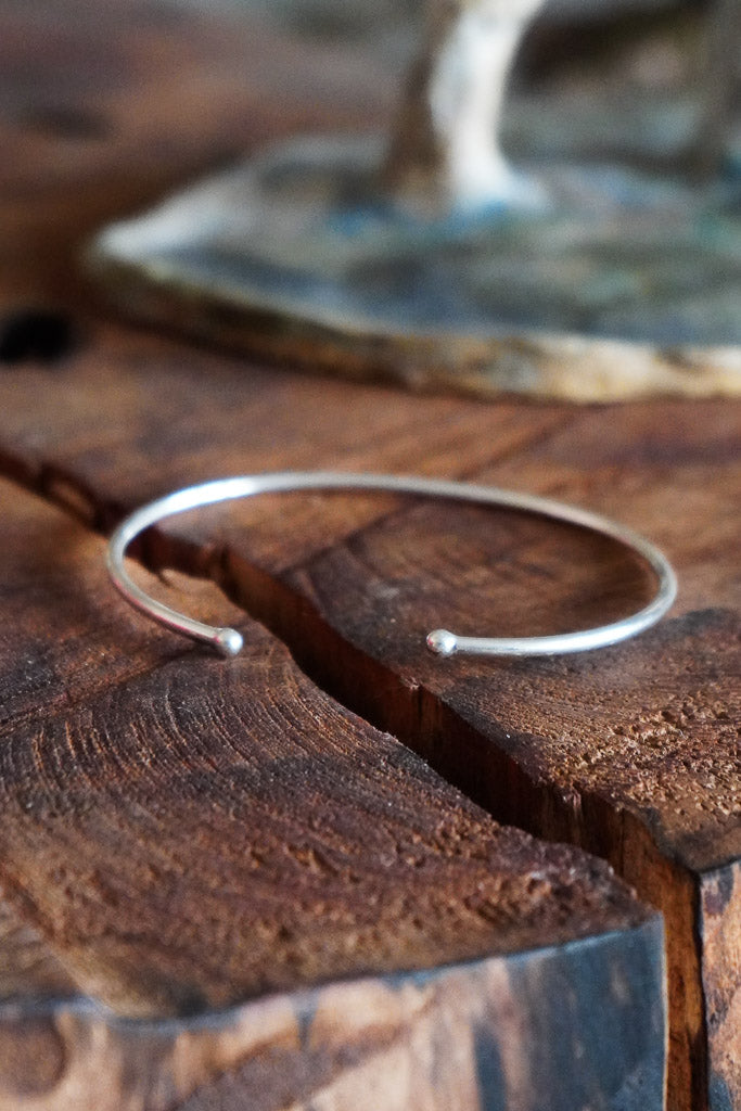 Una esclava delgada con detalle de bolitas en los extremos, cómoda y fácil de poner. Su diseño abierto se adapta bien a la muñeca y es perfecta para usar sola o acompañada de otras pulseras.