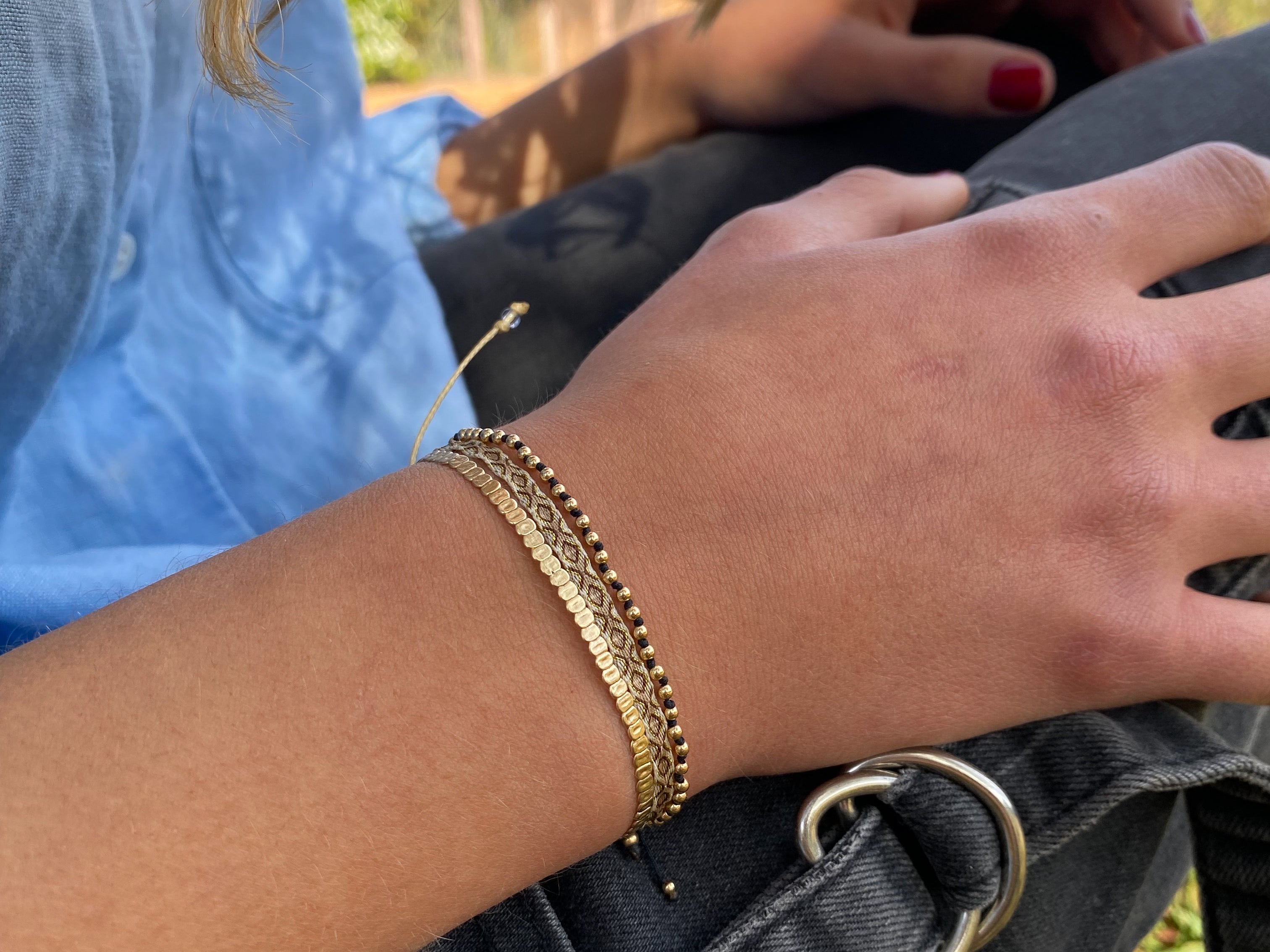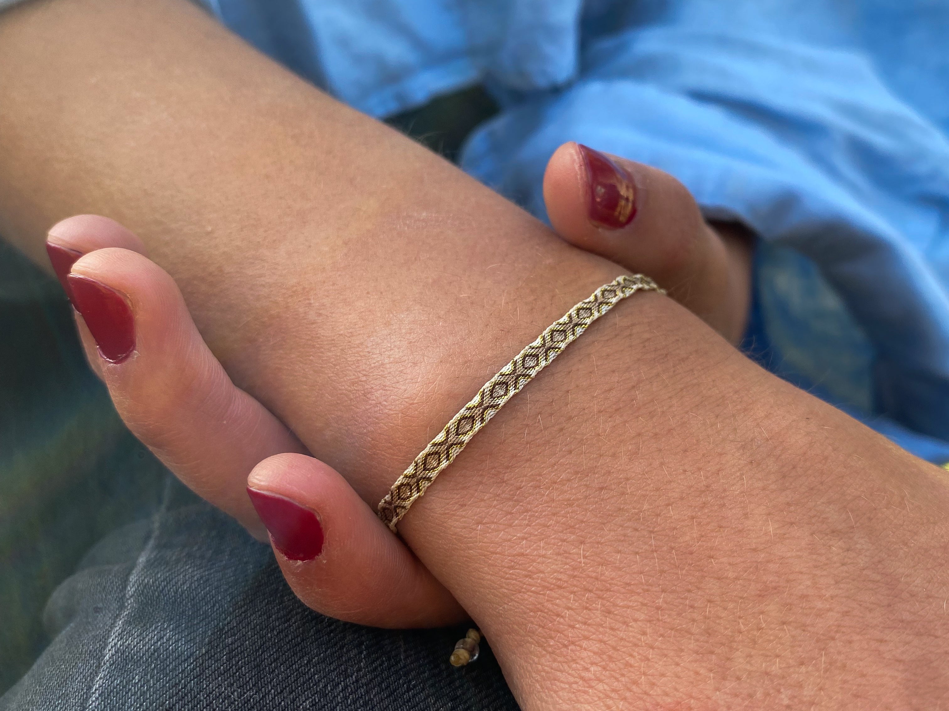 Esta pulsera está hecha a mano en Colombia con hilos de seda en un telar delgado y ajustable. Perfecta para combinar con otras pulseras, agregando color y estilo a cualquier atuendo.