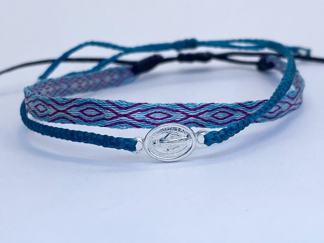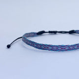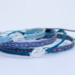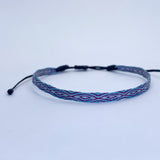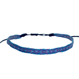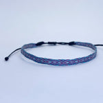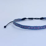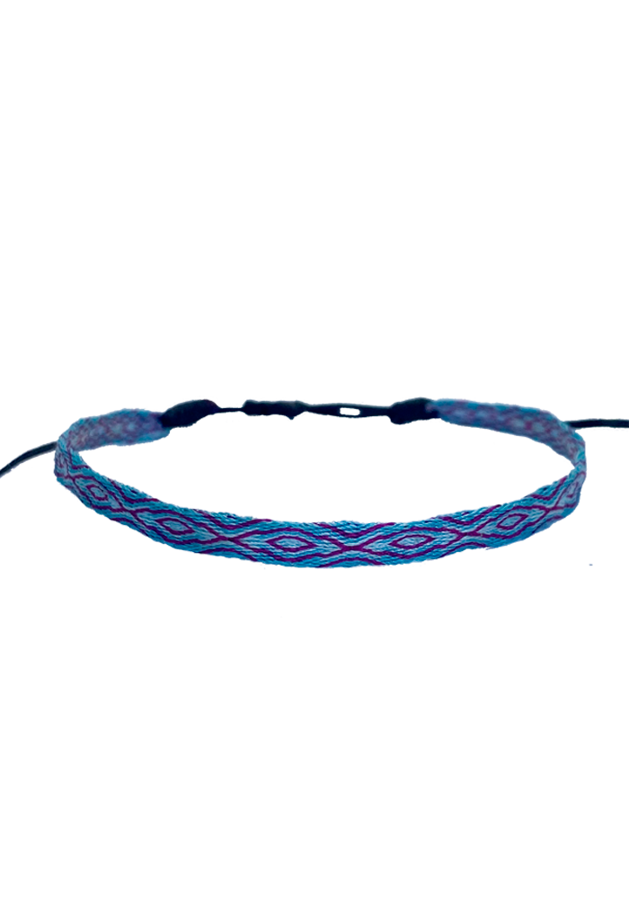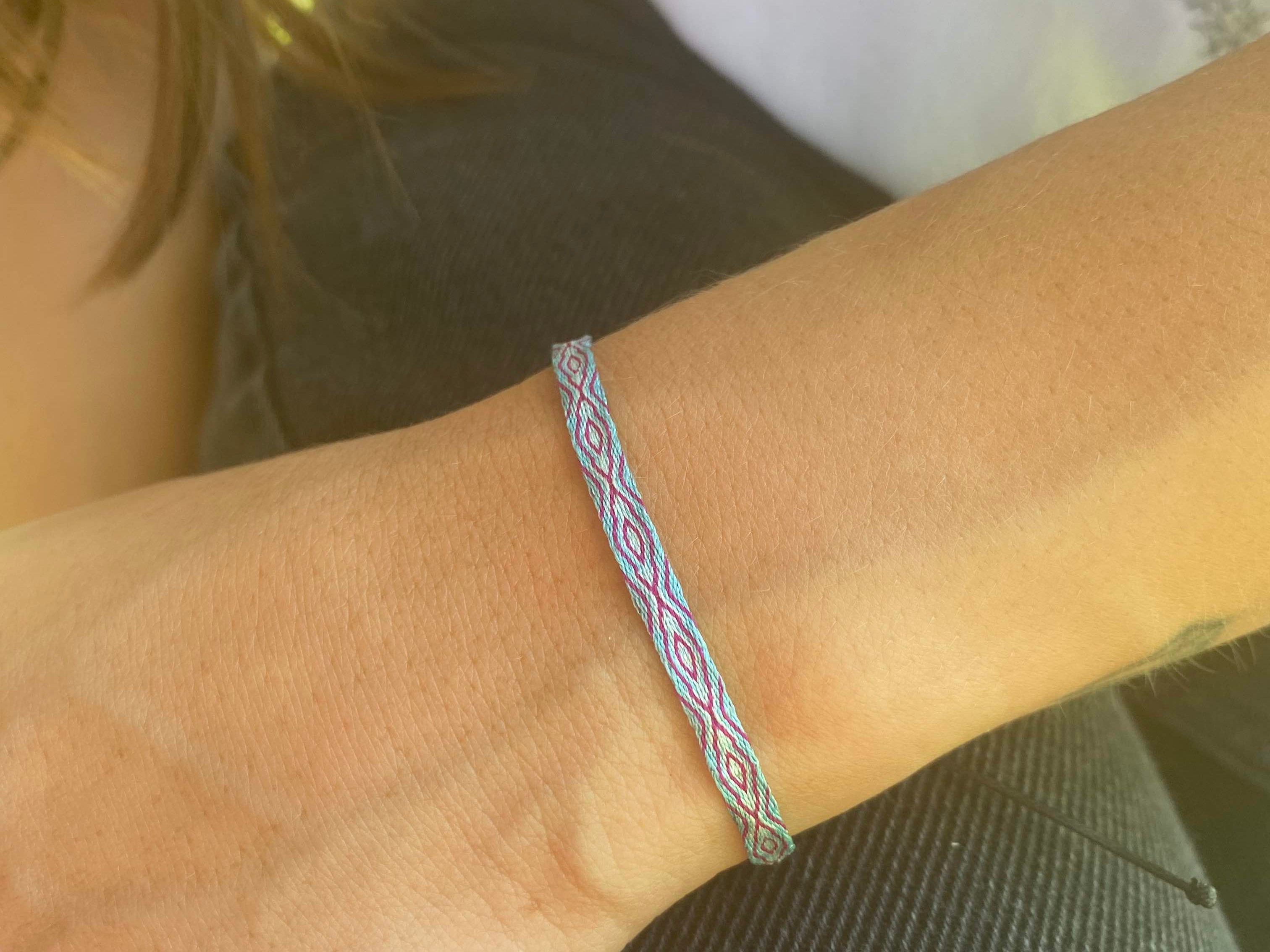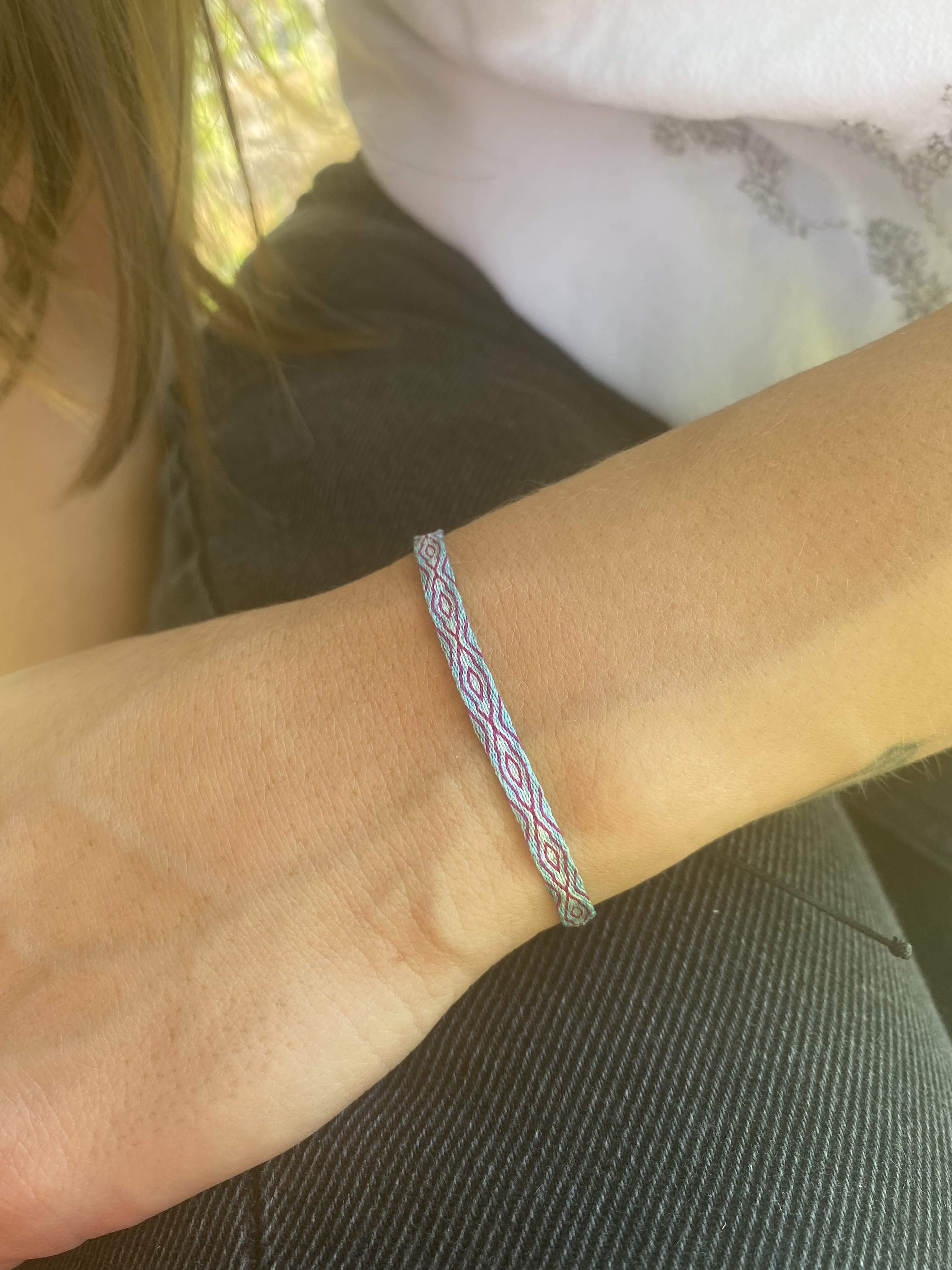 Hecha a mano con hilos de seda, la pulsera telar delgada celeste-lila es el complemento ideal para niñas. Su diseño ajustable y resistencia al agua la hacen perfecta para cualquier ocasión. Originaria de Colombia, no se destiñe y puede combinarse con otras pulseras para un look único.