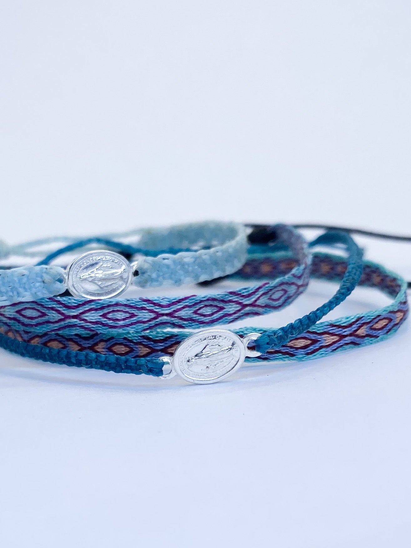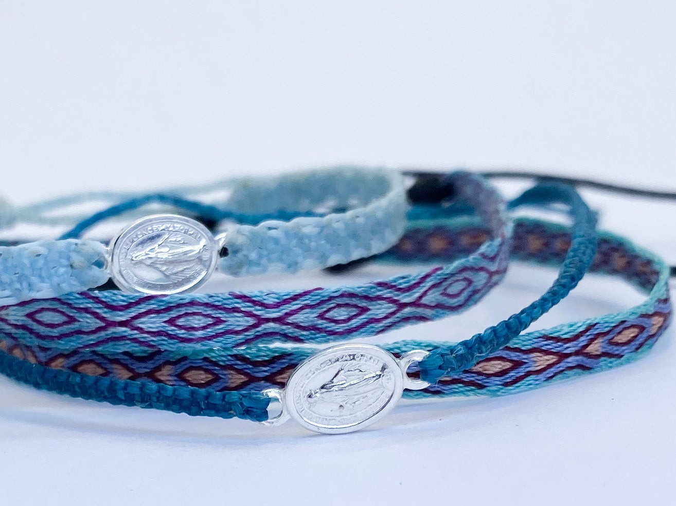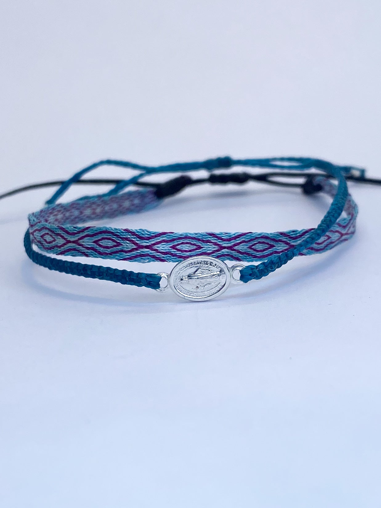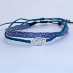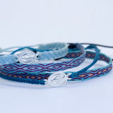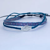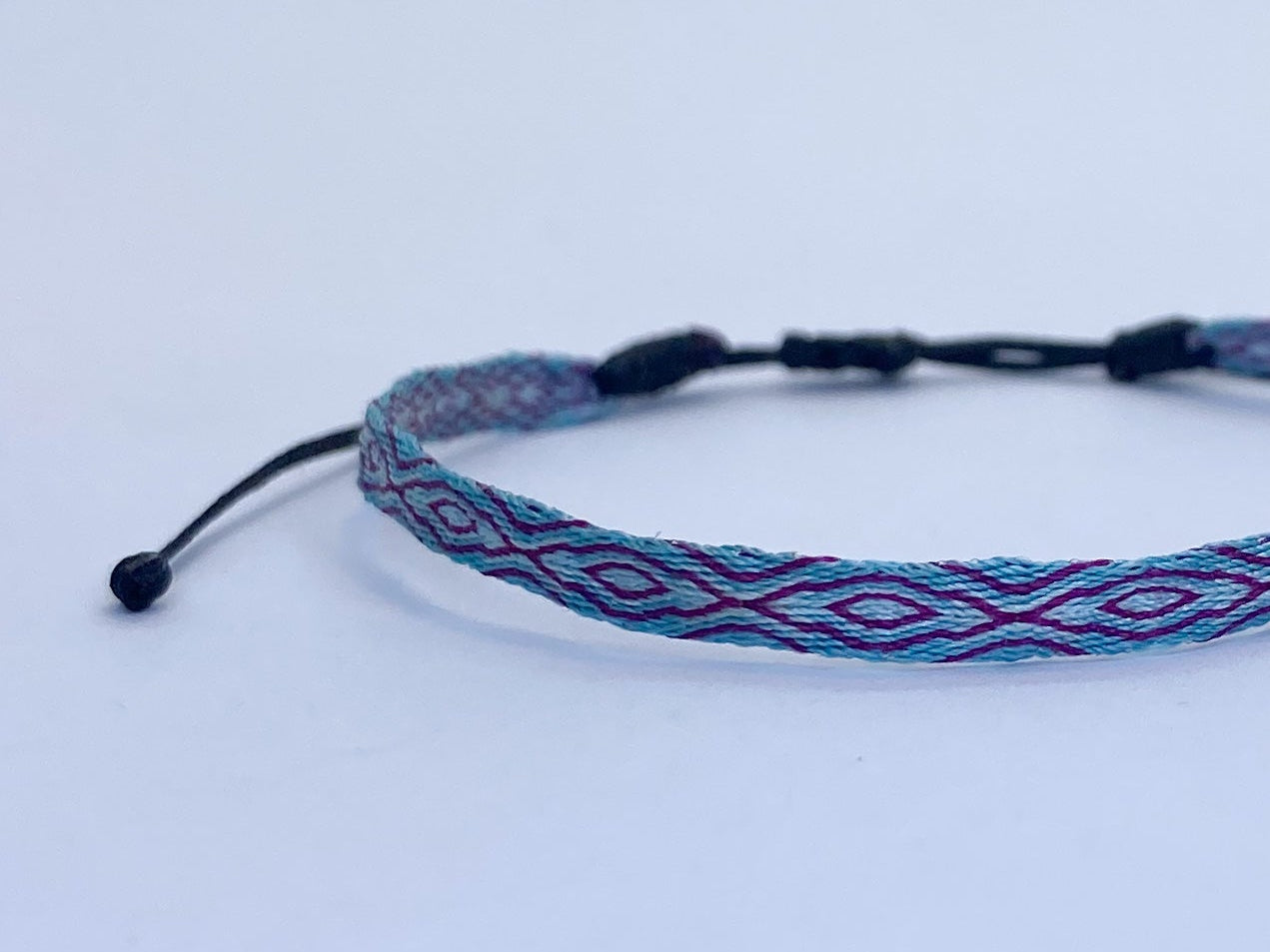 Hecha a mano con hilos de seda, la pulsera telar delgada celeste-lila es el complemento ideal para niñas. Su diseño ajustable y resistencia al agua la hacen perfecta para cualquier ocasión. Originaria de Colombia, no se destiñe y puede combinarse con otras pulseras para un look único.