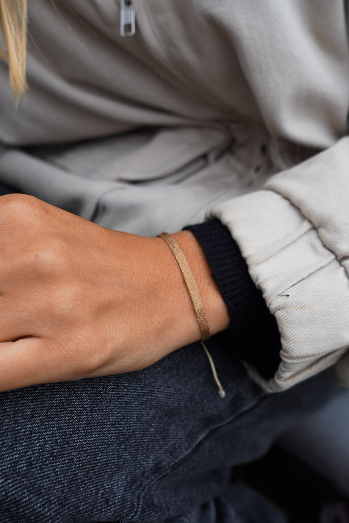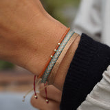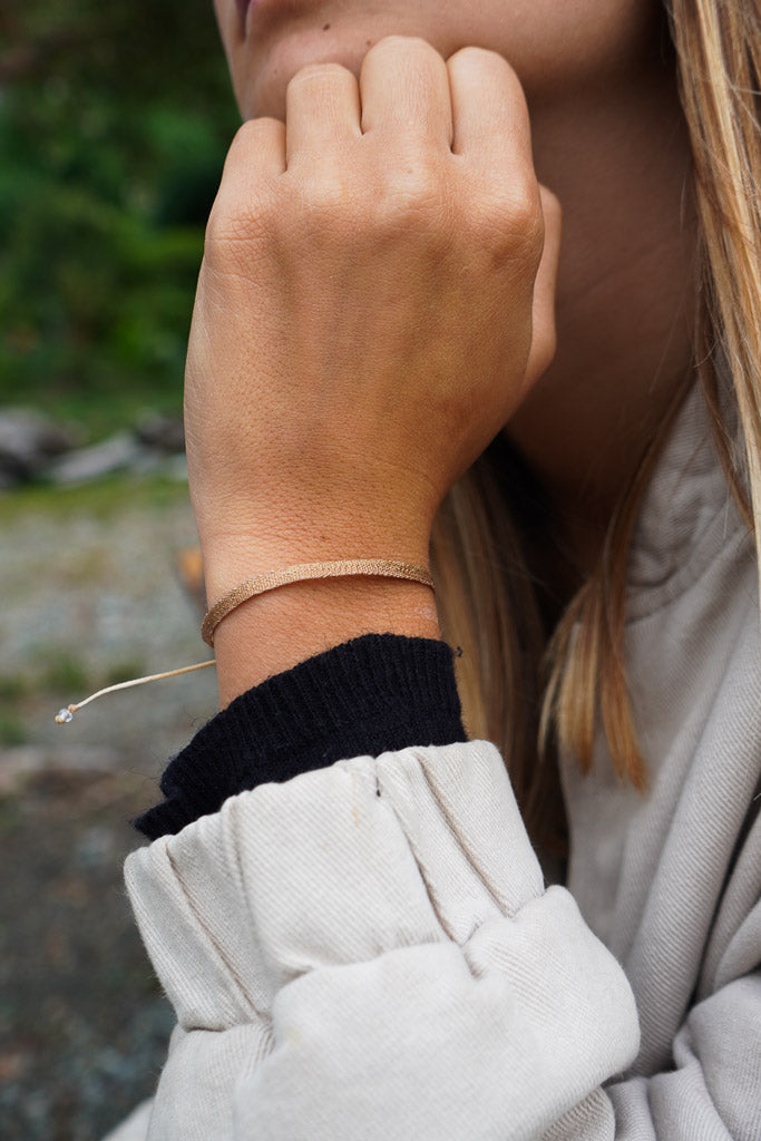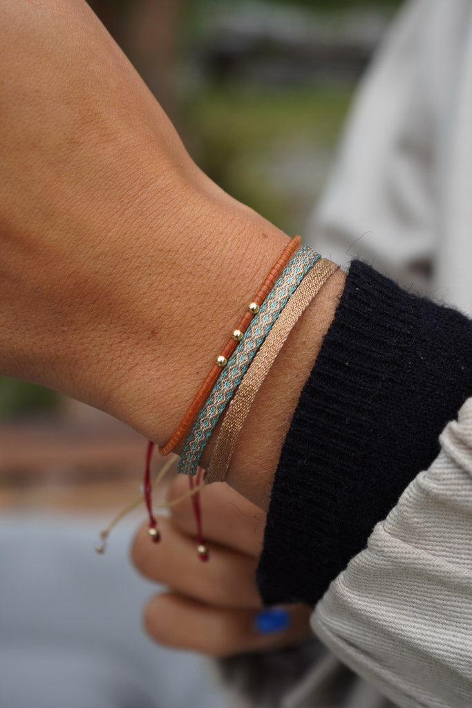 Sutil y luminosa, esta pulsera cobre rosado tejida a telar es ese toque especial que combina con todo. Liviana, ajustable y hecha a mano en Colombia con hilos de seda, es perfecta para usar todos los días, sola o acompañada de otras pulsera de nuestra colección.