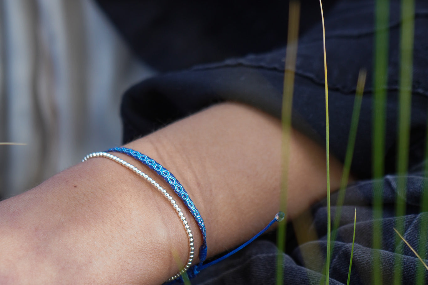 Esta pulsera está hecha a mano en Colombia con hilos de seda en un telar delgado y ajustable. Perfecta para combinar con otras pulseras, agregando color y estilo a cualquier atuendo.