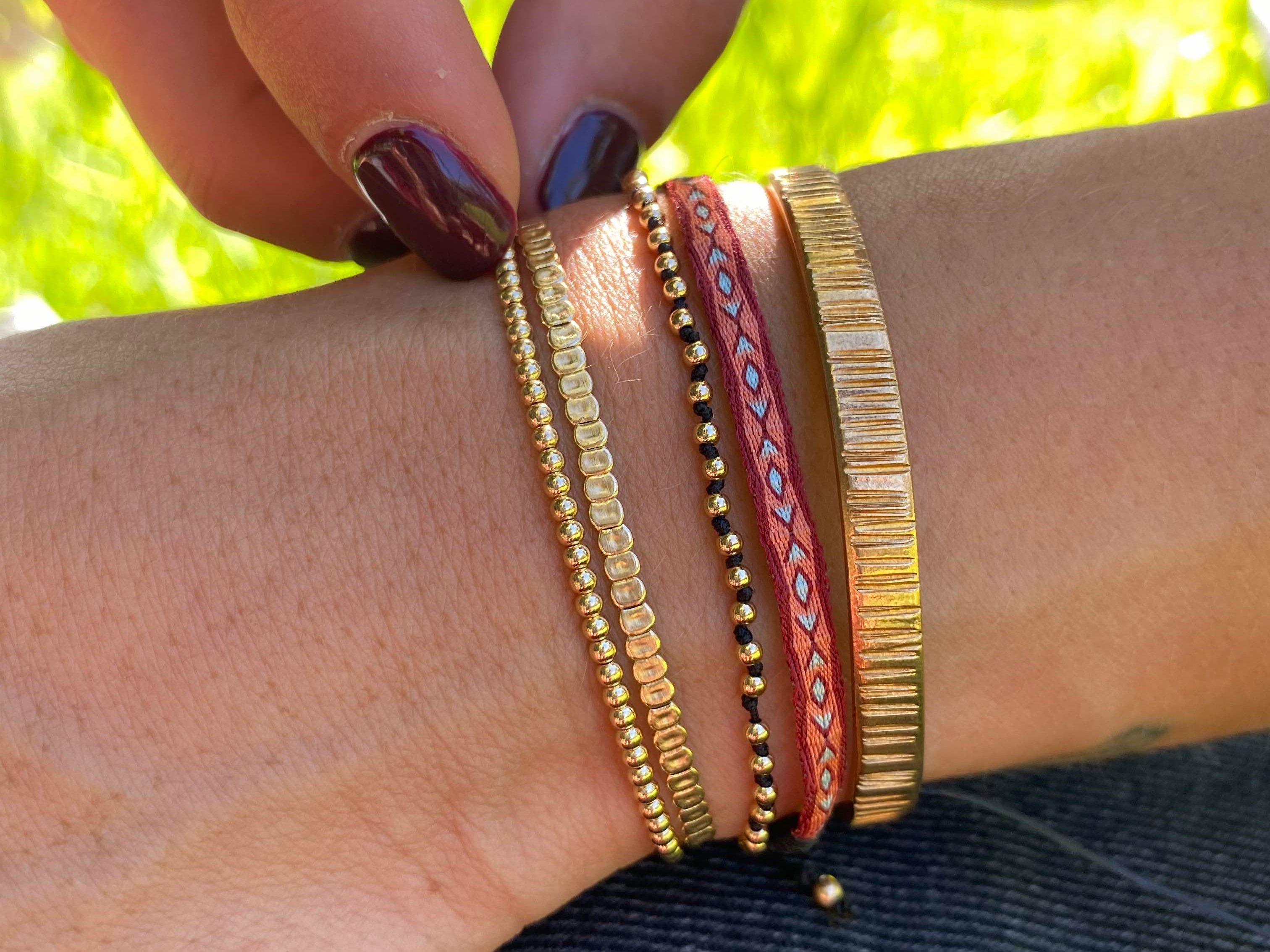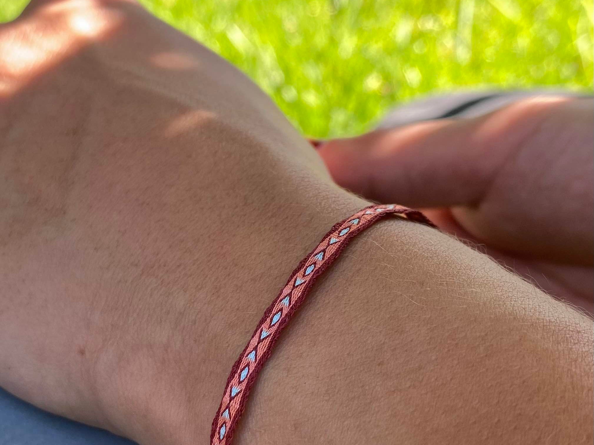 Esta pulsera telar delgada rosa está hecha a mano por artesanos con hilos de seda ajustables. Añade un toque artesanal y único a tu estilo con esta pulsera duradera y ajustable. Perfecta para cualquier ocasión y combinarlas con otras pulseras