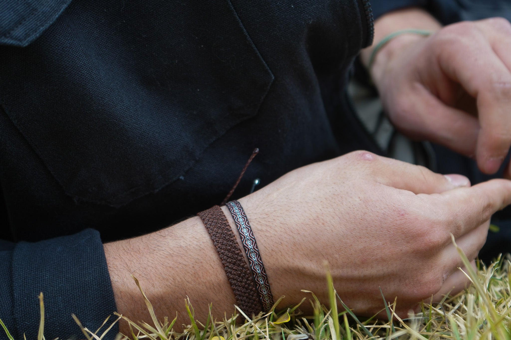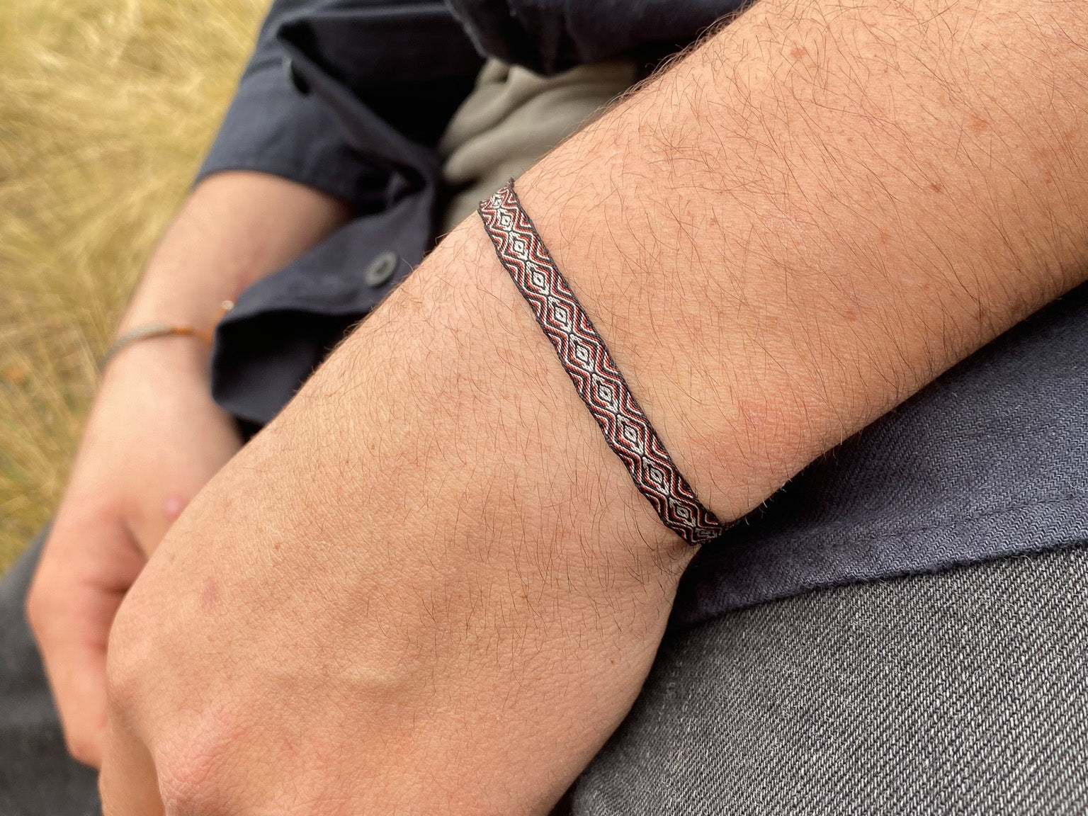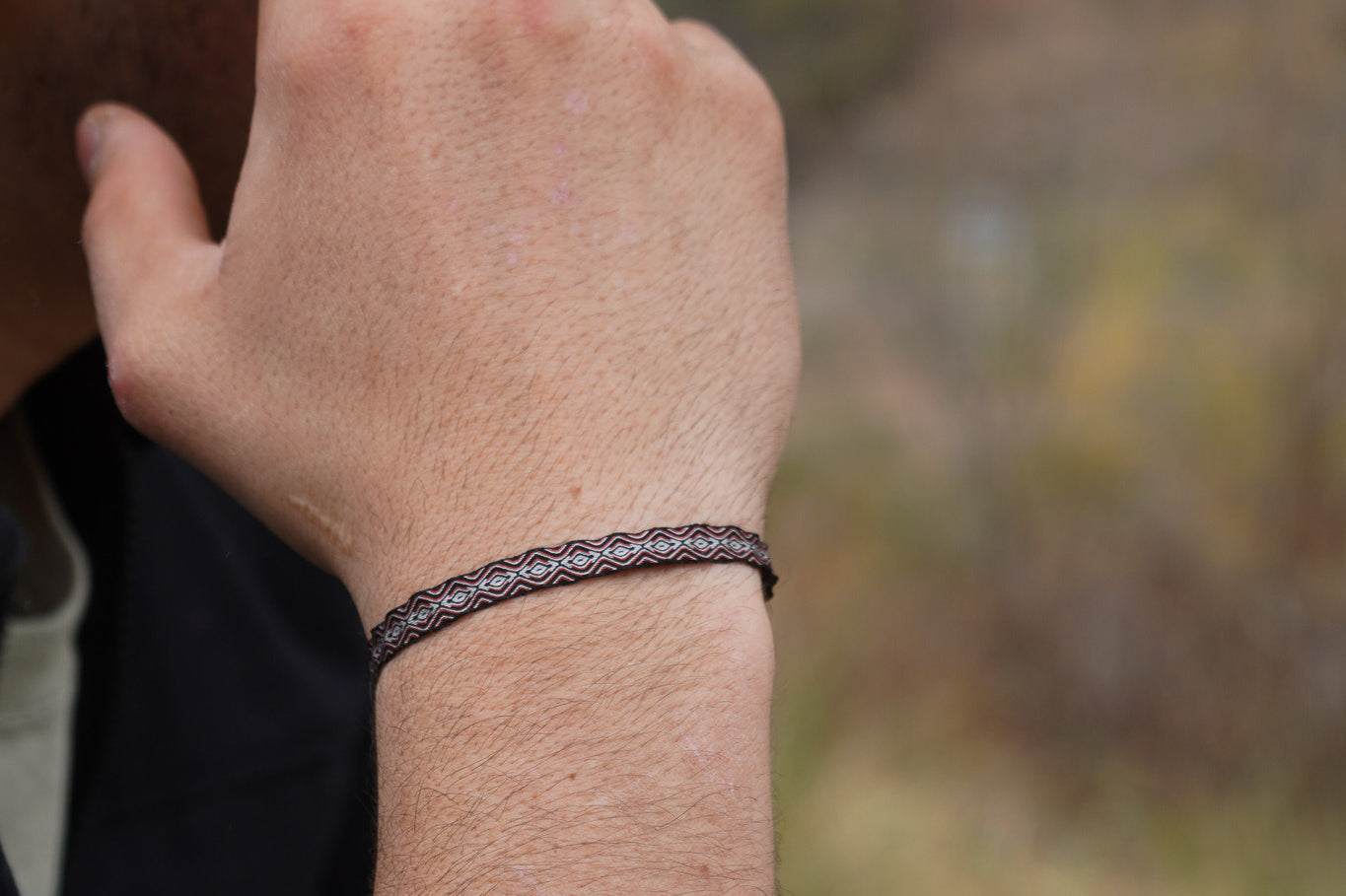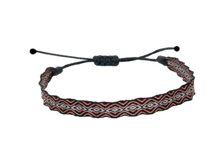 La pulsera Telar Negros Tierra Hombre es elegante y versátil. Hecha a mano en telar, es  ajustable con hilos de seda,  presenta un diámetro de 22 cm.Es perfecta para combinar con otras pulseras para un look único.