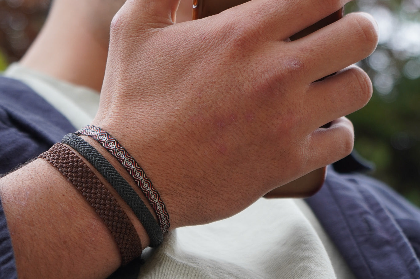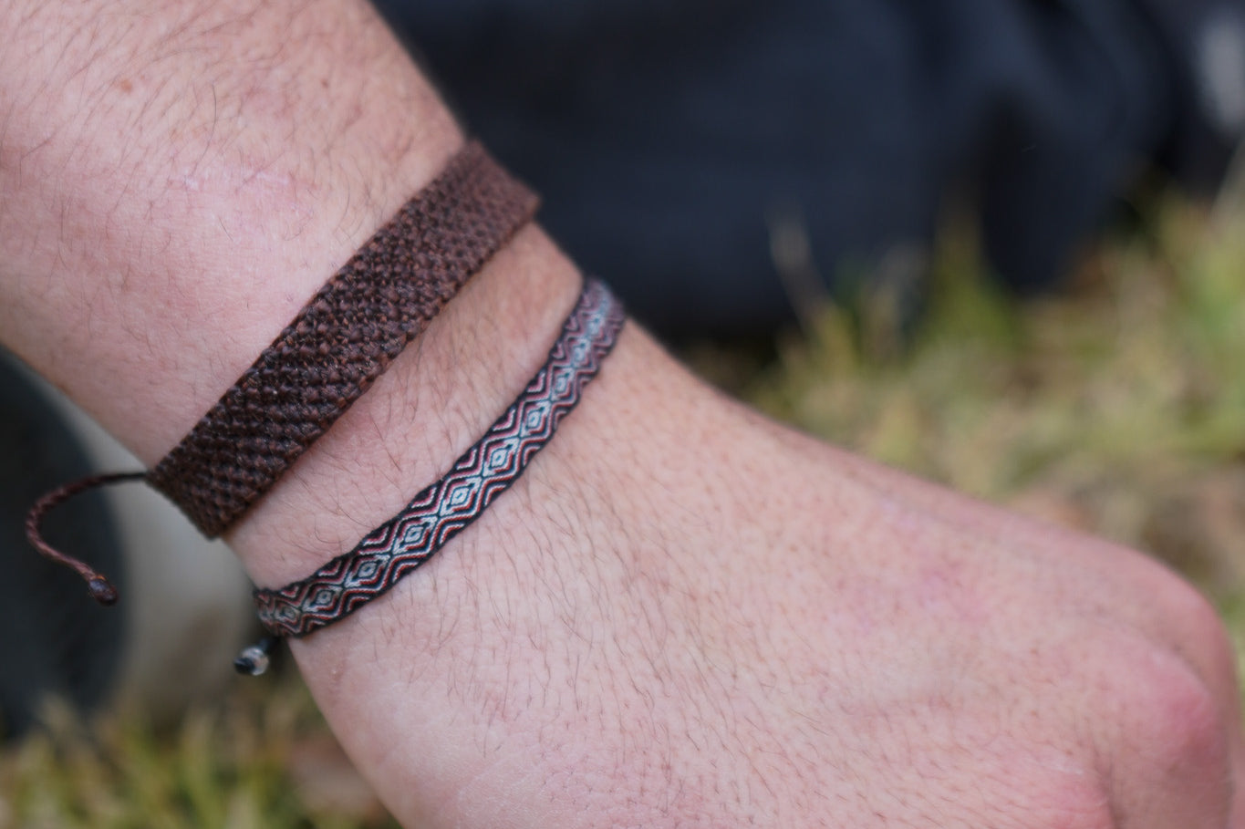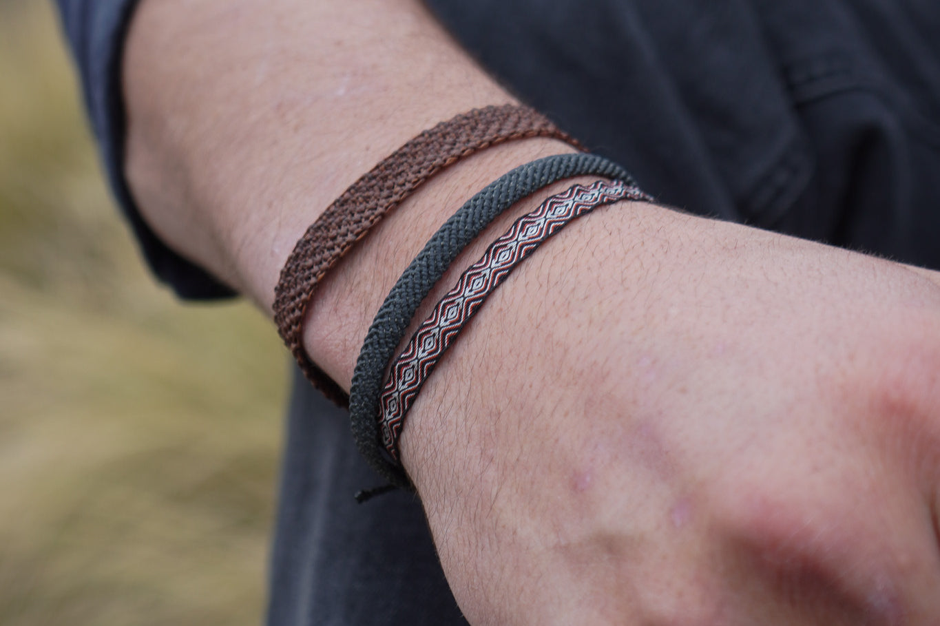 La pulsera Telar Negros Tierra Hombre es elegante y versátil. Hecha a mano en telar, es  ajustable con hilos de seda,  presenta un diámetro de 22 cm.Es perfecta para combinar con otras pulseras para un look único.