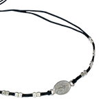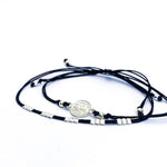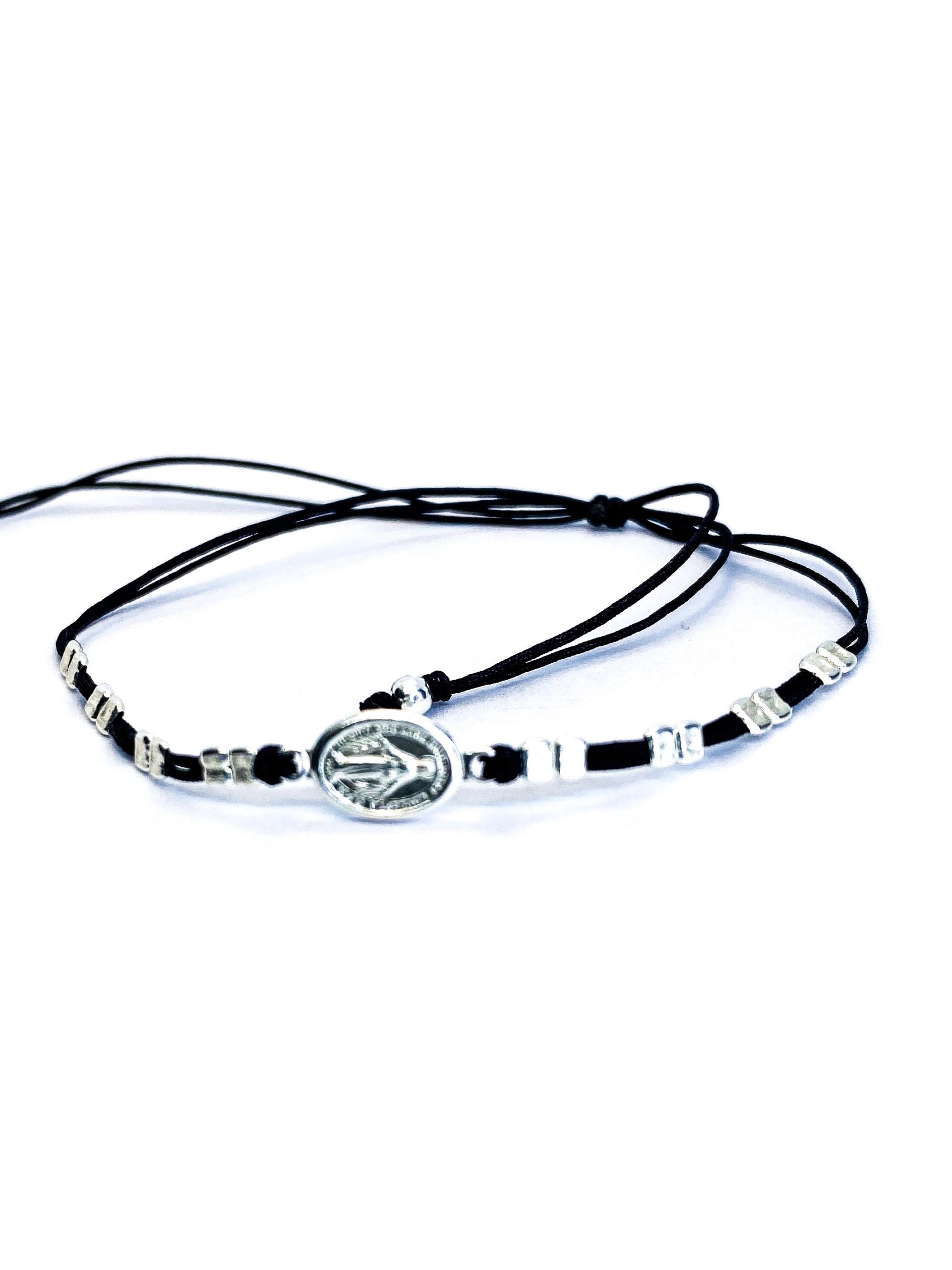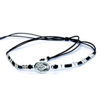 Esta pulsera ajustable cuenta con un diseño único que combina elementos tradicionales como la Virgen horizontal con un toque moderno de cuadrados de plata. Además, el hilo negro le da un aspecto elegante y versátil. ¡Lleva contigo la protección y estilo con esta pulsera!